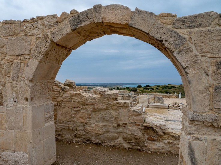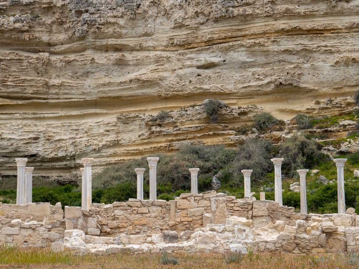 Though we felt like we had seen sufficient ancient ruins to last us at least a few years, our host suggested that a Kourion visit was a must-do. Only a half-hour drive from home, we followed Google Maps to Ancient Kourion. We knew we hadn’t quite got it right, when we arrived at only one fenced site, but were quite happy we had gone a bit astray. The remains of this 6th Century Christian beach-front basilica were beautiful against the dramatic layers of the cliffs behind them.
