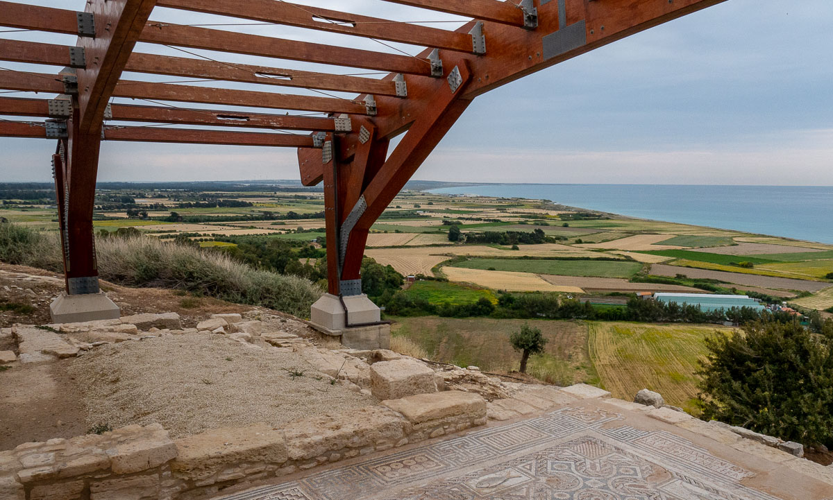 A little backtracking and sign-following got us up to the top of the cliff above the basilica and into the Kourion grounds. Part of the UNESCO World Heritage Site of Paphos, the Cyprus Department of Antiquity has done a really nice job of enhancing the site of these ruins. Imposing arched translucent rooves cover some of the more delicate mosaic floors, and walkways allow visitors to get out into and over the excavations without causing damage. Green spaces and blossoming gardens along with farmland and Mediterranean views add to the beauty of the site.
