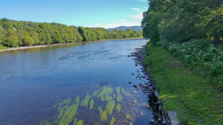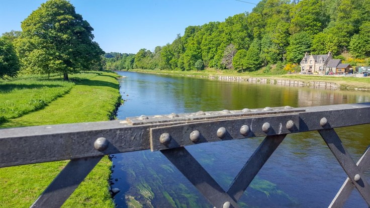 Our first stop was to Aberlour, where Ken and Janice (the committed scotch drinkers in our group) had booked the Casks from the Past tutored tasting session that included scotch not available to the public. Ken and I had visited Aberlour on our first turn through Speyside but, being offseason, there were no tours or tastings available. This was a relatively pricey tour but an eagerly anticipated treat. Mike and I walked to the nearby river and into town while our spouses imbibed.