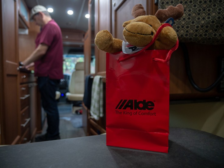 We drove into Alde at about 8:15 on Monday morning. We were greeted by Todd who rolled open a big garage door at the back of the facility and we drove in. Instead of entering a service bay we drove into a spotlessly clean distribution warehouse, with high shelving loaded with boxes. Todd welcomed us, introduced us to Max, the technician, and invited us to hang out in their break room or waiting area. Todd also introduced us to Heather and Mandy. Everyone was so generous, encouraging us to enjoy their snacks and make ourselves comfortable. Heather even handed us a little Alde goody bag.