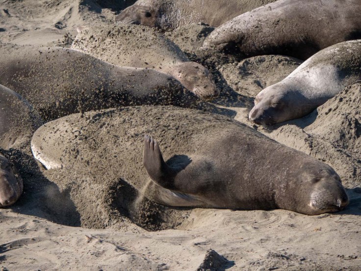A little north of the Hearst beach, we pulled over to ogle the elephant seals at the Elephant Seal Vista Point. Most of them were just lying on the beach, periodically tossing the sand up over themselves, presumably to keep cool.