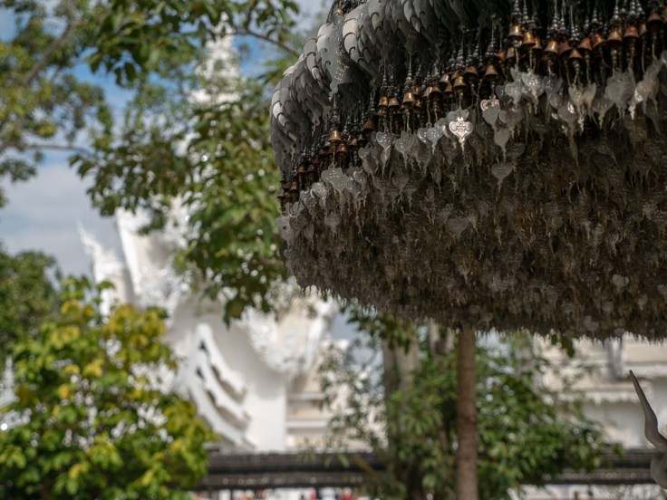 Though we were turned off by the bedazzled kitchiness, it was fully appreciated by hordes of tourists posing for photos at every turn. The temple must also do a roaring business in those seeking luck as thousands of beaded metal hearts, each bearing the donor’s name, are grouped into shade structures and ornamental trees.