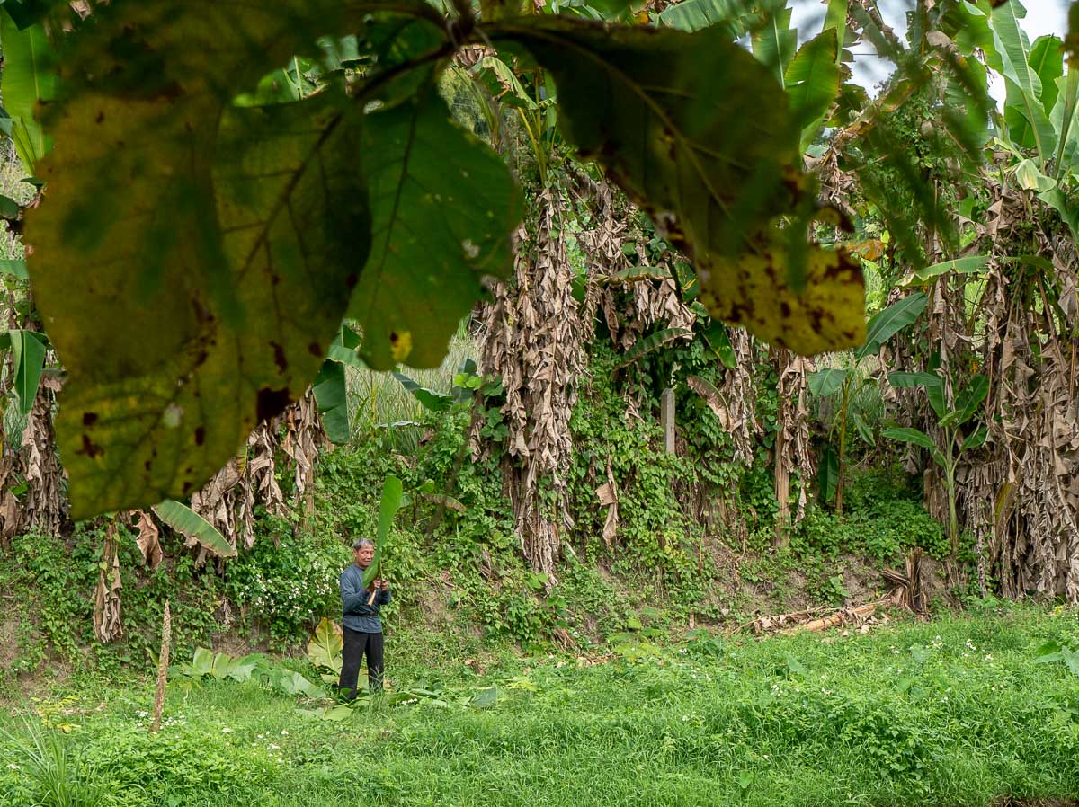 Not part of our tour, most of the other van passengers went into the village for 30 minutes while we hung around outside. Though it would have been interesting to see the long-neck women, we are not that comfortable going into these real-life-for-tourists situations, so we were quite happy that visiting the village wasn’t part of our package. We had two choices for waiting: the marketplace or the parking lot. From the parking lot, we were able to look across a canal or river to see this fellow stripping palm leaves from their stems. Otherwise, we just hung out with the drivers and meandering dogs and chickens until the rest of our group returned.