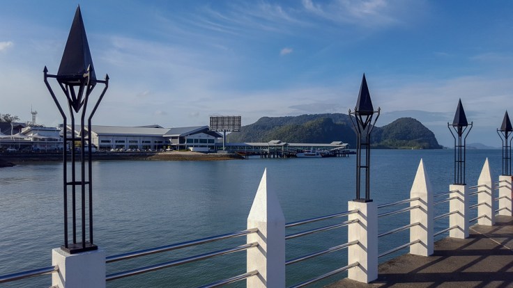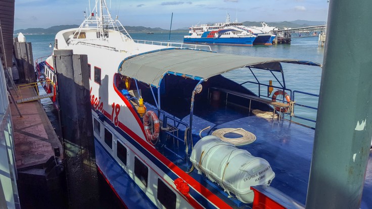 We took a ferry from the Kuah port in Langkawi. The port is watched over by an enormous eagle, and the terminal is very modern and large. We wandered through a few huge and empty halls (except for unused security equipment) before arriving at our waiting area.