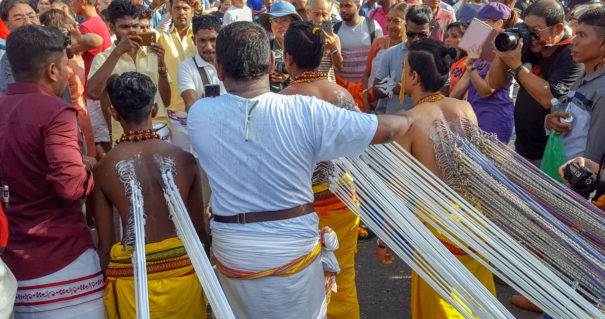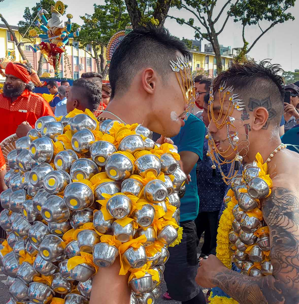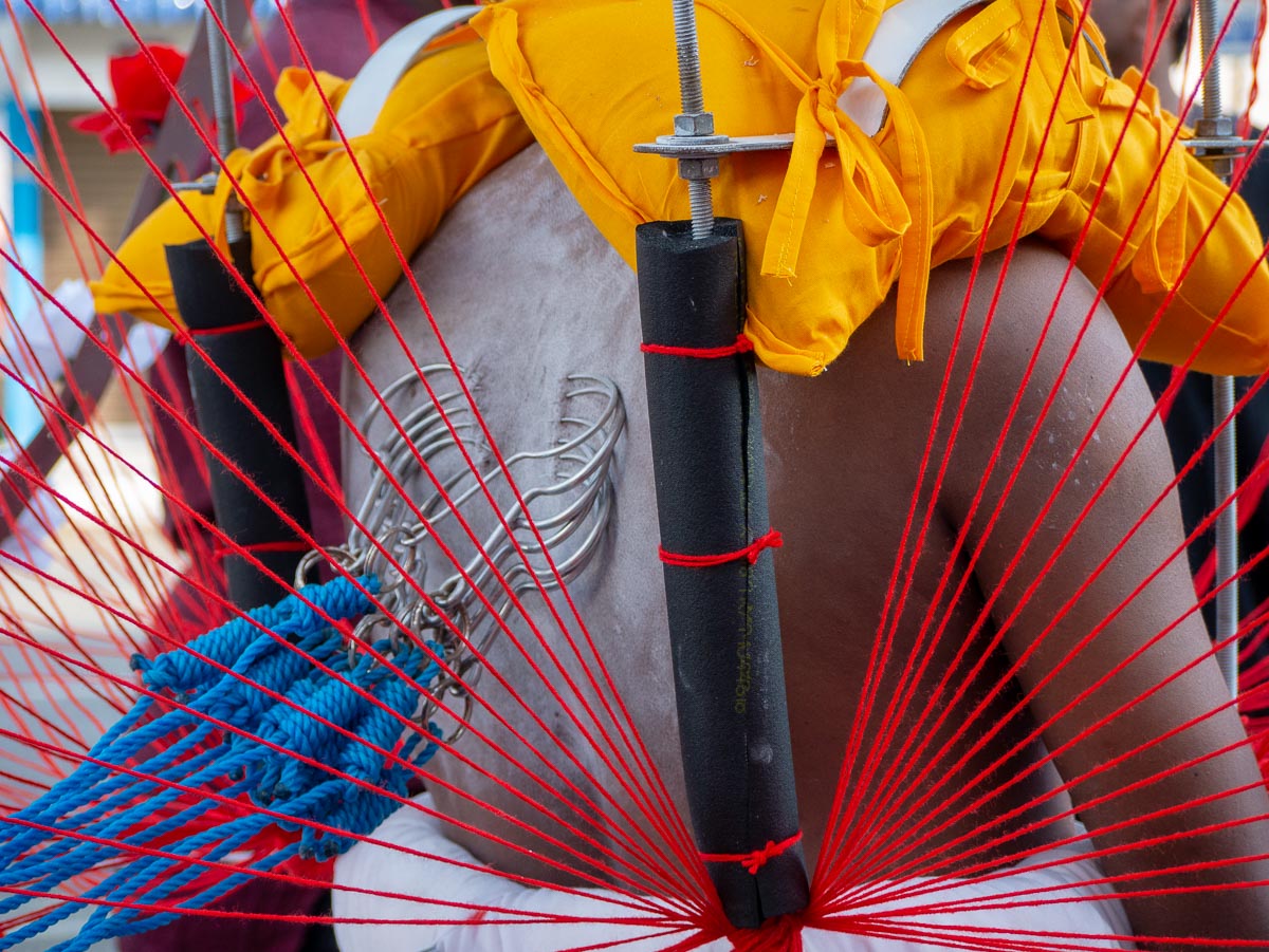 Throughout the day, devotees come together on the site of the Lorong Kulit Flea Market and, with teams of helpers, prepare their bodies before taking to the street to dance and carry their burdens. For some, the piercings are the burden as they are weighted down with bells or shells. Others have ropes attached to the hooks in their backs and pull friends along the route or bear the weight of huge and colorful structures.