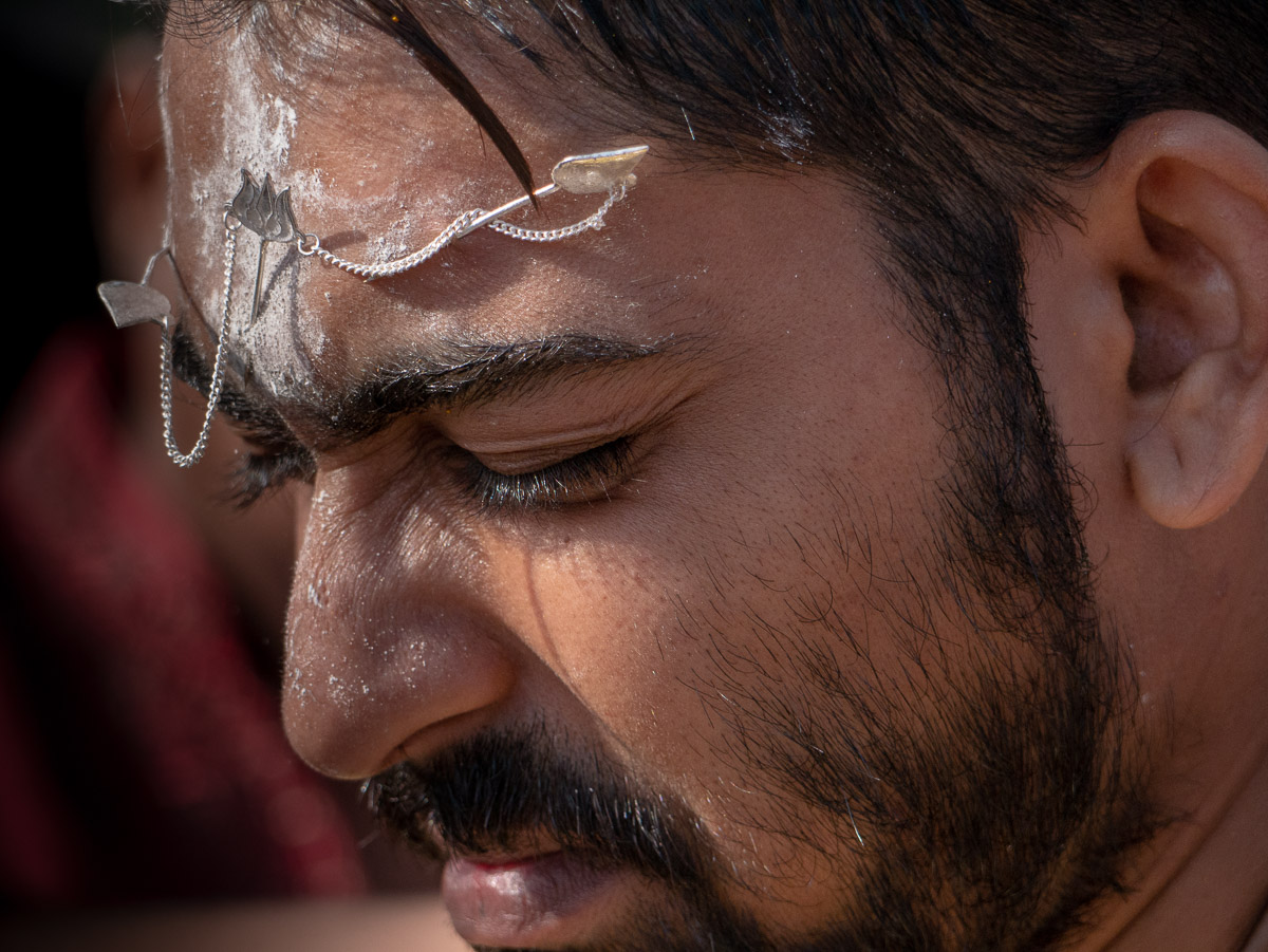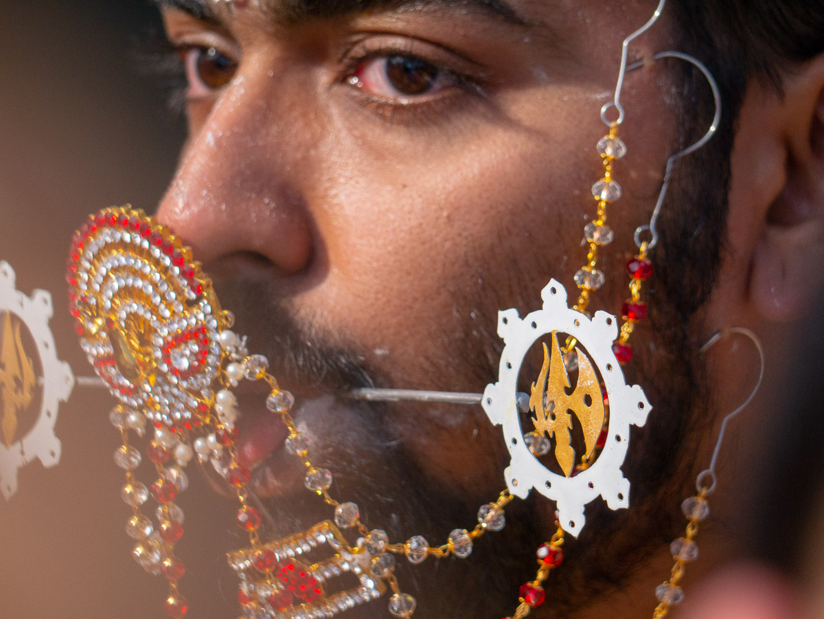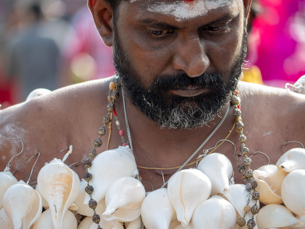 Throughout the day, devotees come together on the site of the Lorong Kulit Flea Market and, with teams of helpers, prepare their bodies before taking to the street to dance and carry their burdens. For some, the piercings are the burden as they are weighted down with bells or shells. Others have ropes attached to the hooks in their backs and pull friends along the route or bear the weight of huge and colorful structures.