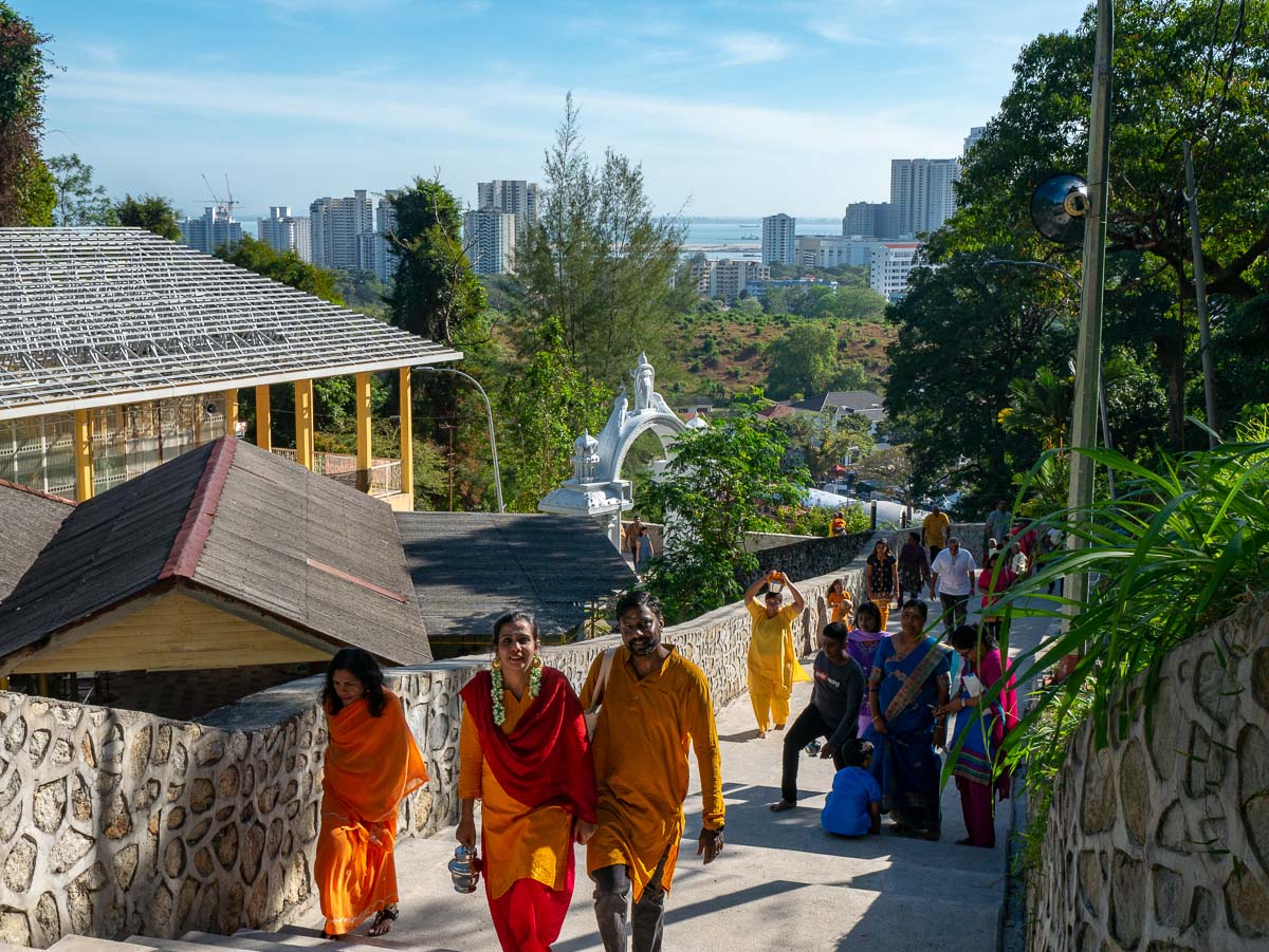 All along the streets near the temple people were busy setting up kiosks and stands with food, drinks, services, and shrines. We walked through the gate and found the bottom of the 513 steps we would need to climb to reach the temple. Though Thaipusam had not yet started, there were still many people coming through the gate and heading up the stairs. Everyone was dressed in their finest, or in orange or yellow (orange is a key color for this festival). Almost everyone was barefoot. We checked with a woman at an information table who gave us the thumbs-up to visit the temple, and to wear our shoes on the stairs, removing them before we entered the place of worship.