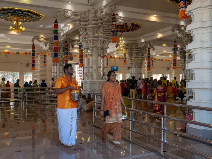 Once inside, we saw several worshipers taking selfies, but we didn’t want to intrude. Everyone was friendly and welcoming, and several stopped to explain details like the significance of Lord Murugan, and the milk offerings that people were bringing in little metal buckets, boxes and bottles. The milk is poured into huge vats, and then Lord Murugan, who is housed inside his own shrine, is doused with the contents. A spigot on the outside of the shrine offers up the now-blessed milk and people take a little in their containers for later consumption. The milk used to flow down the mountainside in troughs, but now the white-painted troughs contain only water.