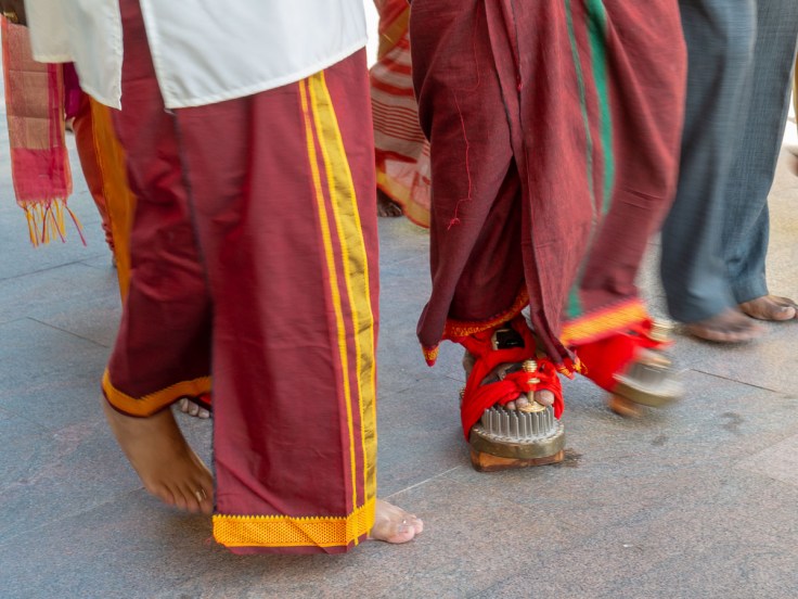 Outside the temple we heard loud chanting and found a group of people performing a call-and-answer chant, accompanied by drumming. They climbed the stairs and then proceeded slowly around the outside of the temple before entering it. I noticed an older man in the center of the group being assisted by others to walk. Ken pointed out that his footwear appeared to be small beds of nails.
