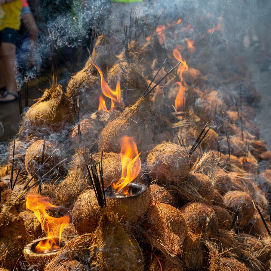 The process is fascinating. All along the route are piles of coconuts, some being watered down, some afire with incense, and some topped with offerings.