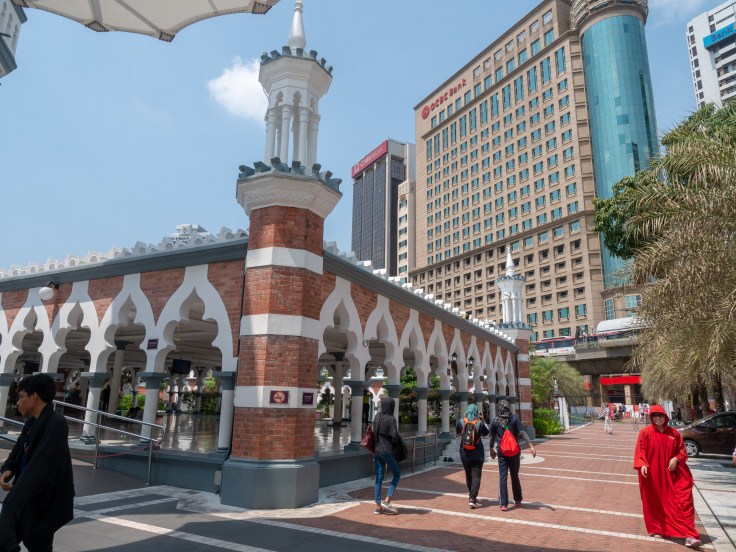 Masjid Jamek Kuala Lumpur (Jamek Mosque) sits picturesquely at the confluence of two rivers. We had viewed it from a bridge some days earlier, but Ken wanted to return and go inside.