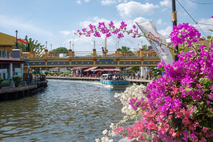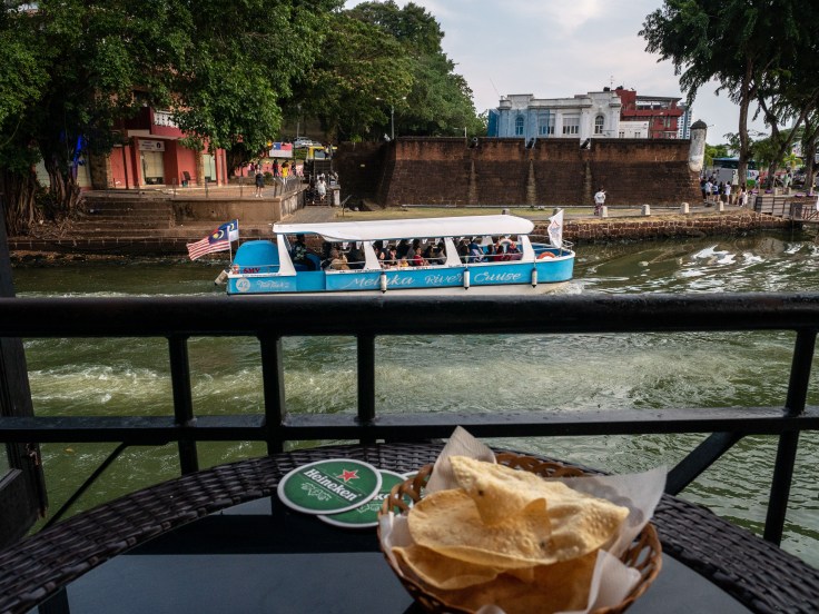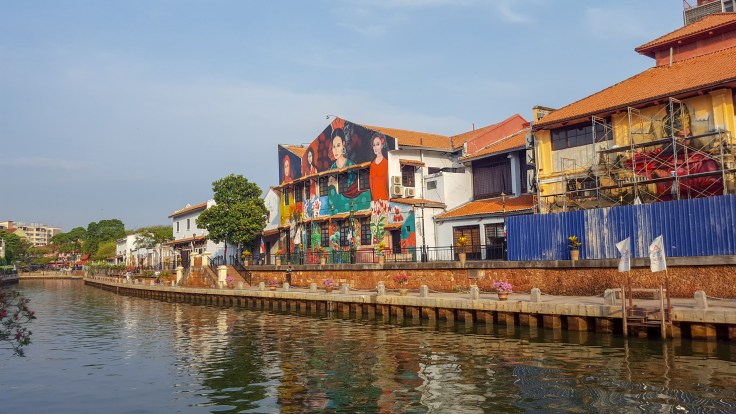 The Malacca River serpentines its way through the heritage area of Malacca (or Melaka as it is also written). Low buildings, most no more than 3 or 4 stories high, sit shoulder to shoulder along the water’s edge, fronted by a walkway in some areas. Many of the buildings have been painted with huge murals or colourful abstracts. Bridges across the river carry ornate facades. All provide plenty of interest for visitors.