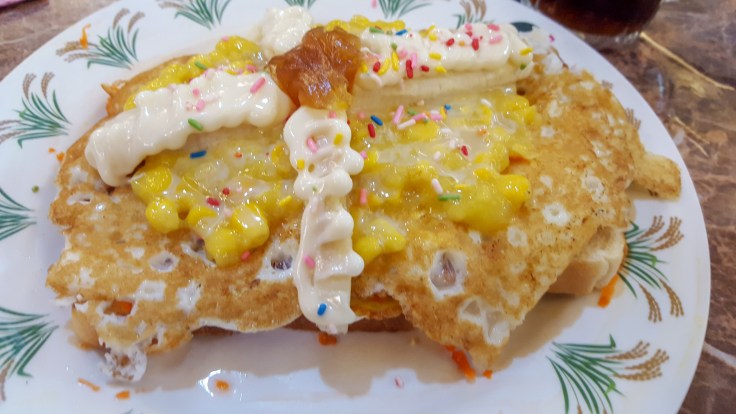 In an effort to pick a non-spicy dish and something that didn’t come with rice (just getting tired of it), I asked about a series of menu items called Roti John (for example USA Roti John, Korean Roti John). Struggling with the images on the menu, I asked a few questions, sort of got answers, ordered the Japan Roti John, and ended up with a very strange dish. It was bread (the roti), egg, chicken (though I never did find this), cream corn, strips of banana, mayo on top of the banana, and coloured sprinkles on top of that, with a dollop of what I think was coconut jam in the center. I think I’m going to have to learn to eat spicy foods–this was edible, but not at all what I was expecting.