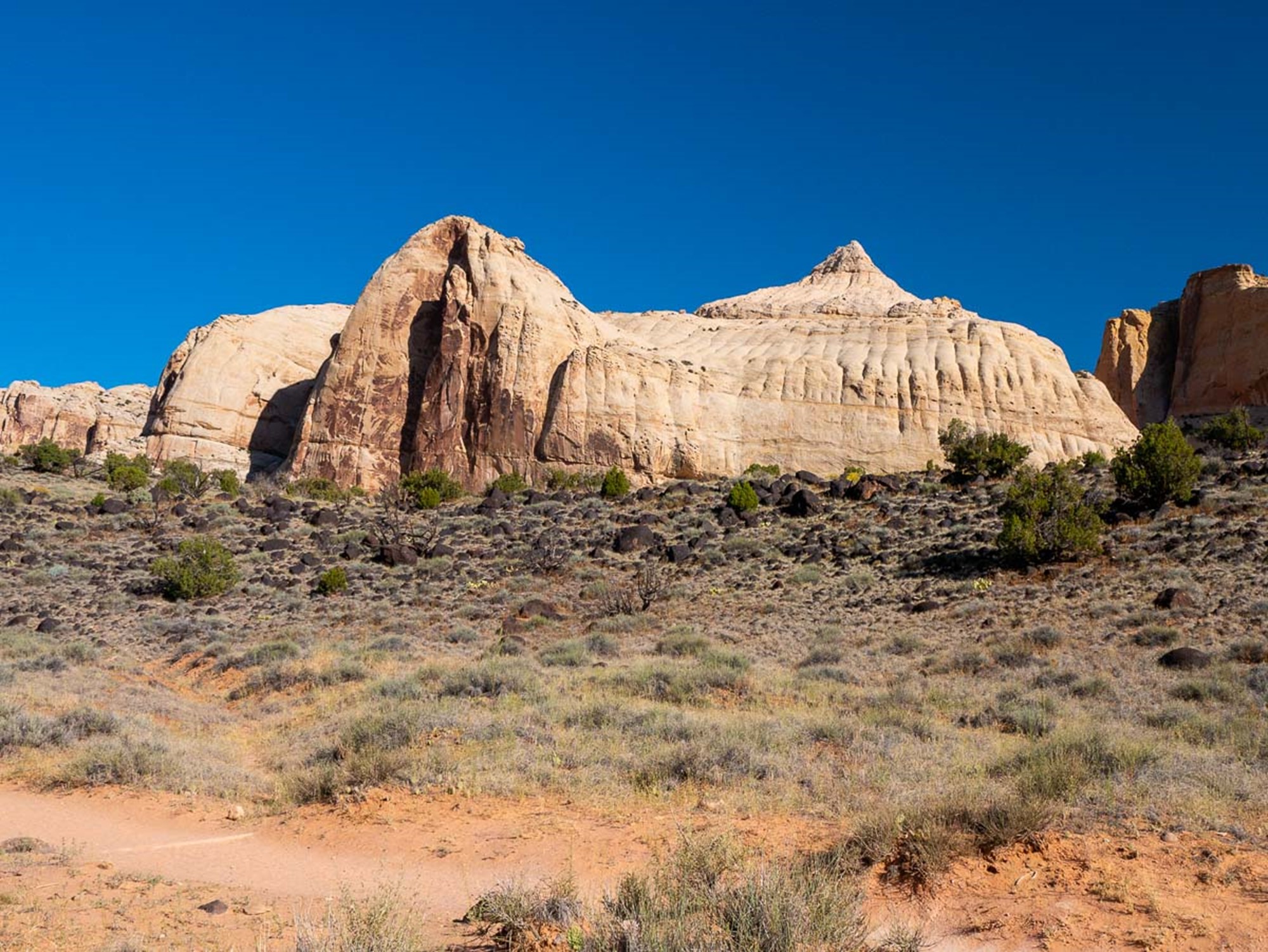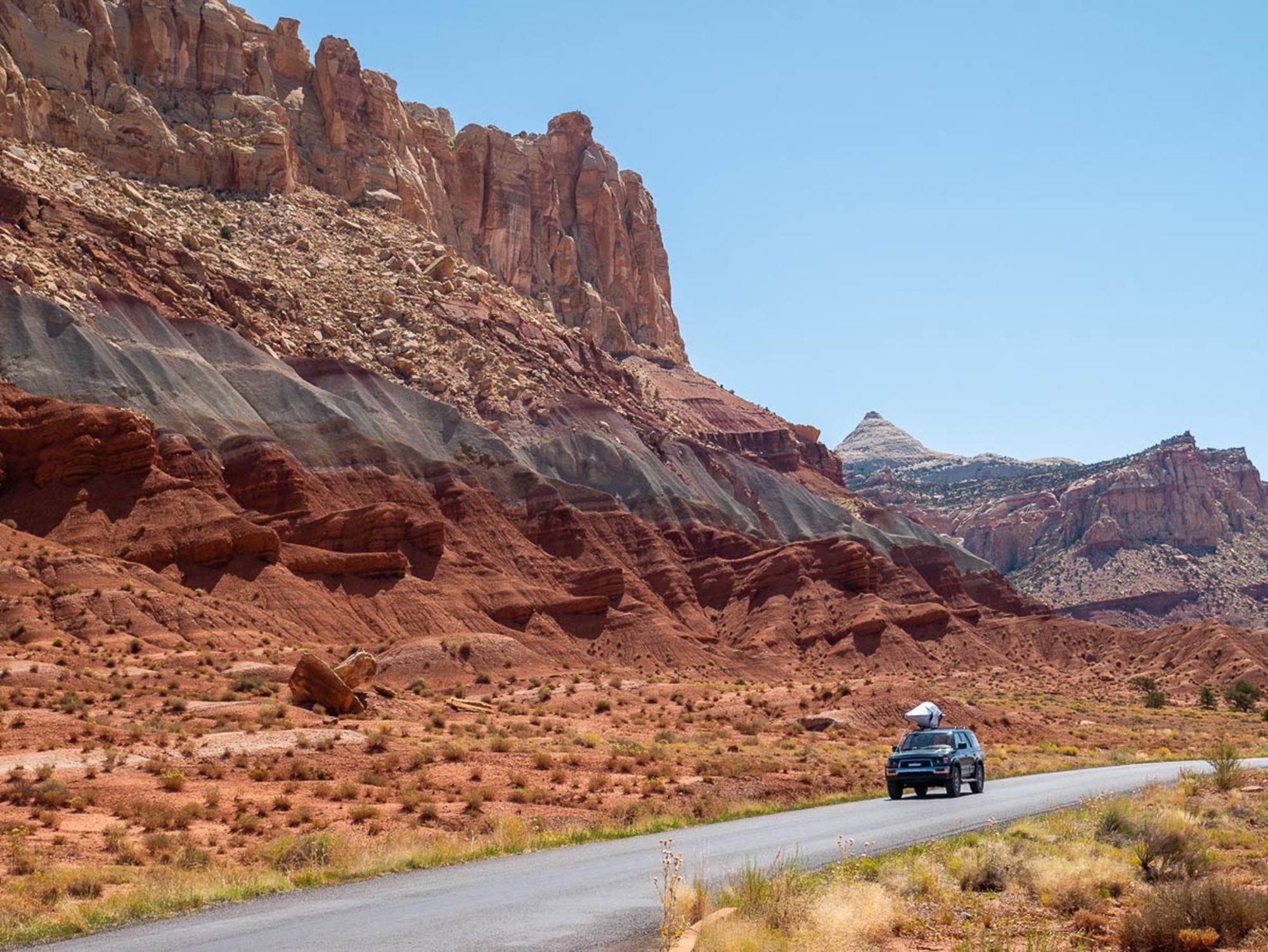With our energy replenished, fridge full, tanks either full or empty as appropriate, our bodies, clothes, bikes and even Artie cleaned (there is a big carwash across the street from the campground along with a tourist information center for the area), we drove the 10 miles to the Capitol Reef Visitor Center. Ken had visited the tourist office near our campground and had been told that it was the cliffs that made Capitol Reef different from the other canyon-centric national parks we had been visiting. The park is named for two geologic landmarks: the 100-mile long Waterpocket Fold—an elevated landmass that acted as a barrier, or reef, to travel; and a white sandstone dome reminiscent of the US Capitol building.