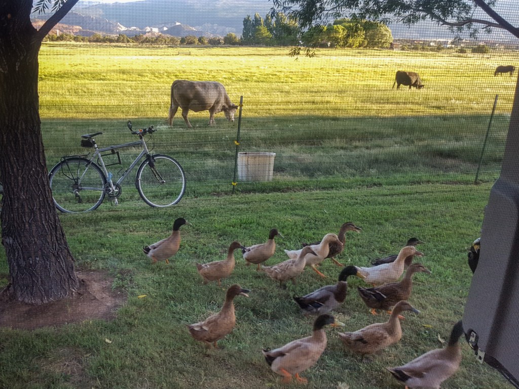 We backed in under trees, had lots of green grass around us, behind us pastures and red rock cliffs beyond that. Cows lazily pulled at the grass behind us, occasionally a beautiful black horse would join them or gallop and gambol around, and several times a raft of ducks quacked along in formation, running one way behind Artie and off to an unknown endpoint, and then a quick turn and they waddled and quacked their way back. The WiFi was relatively strong, shower rooms were the best we’ve ever seen at a campsite, and the laundry equipment was clean and priced fairly. This park was such a nice respite from the dust and desert that we decided to take a break the first day and just hang out and get caught up.