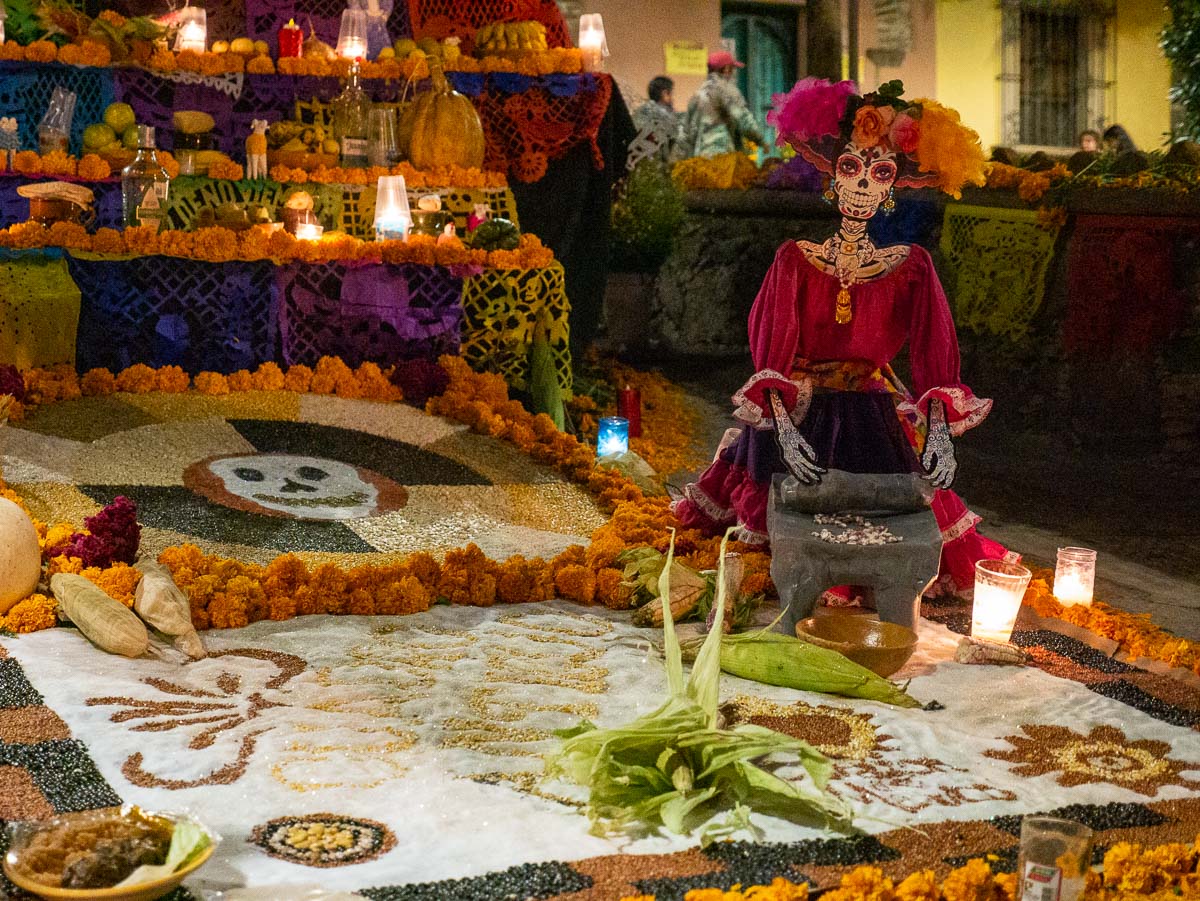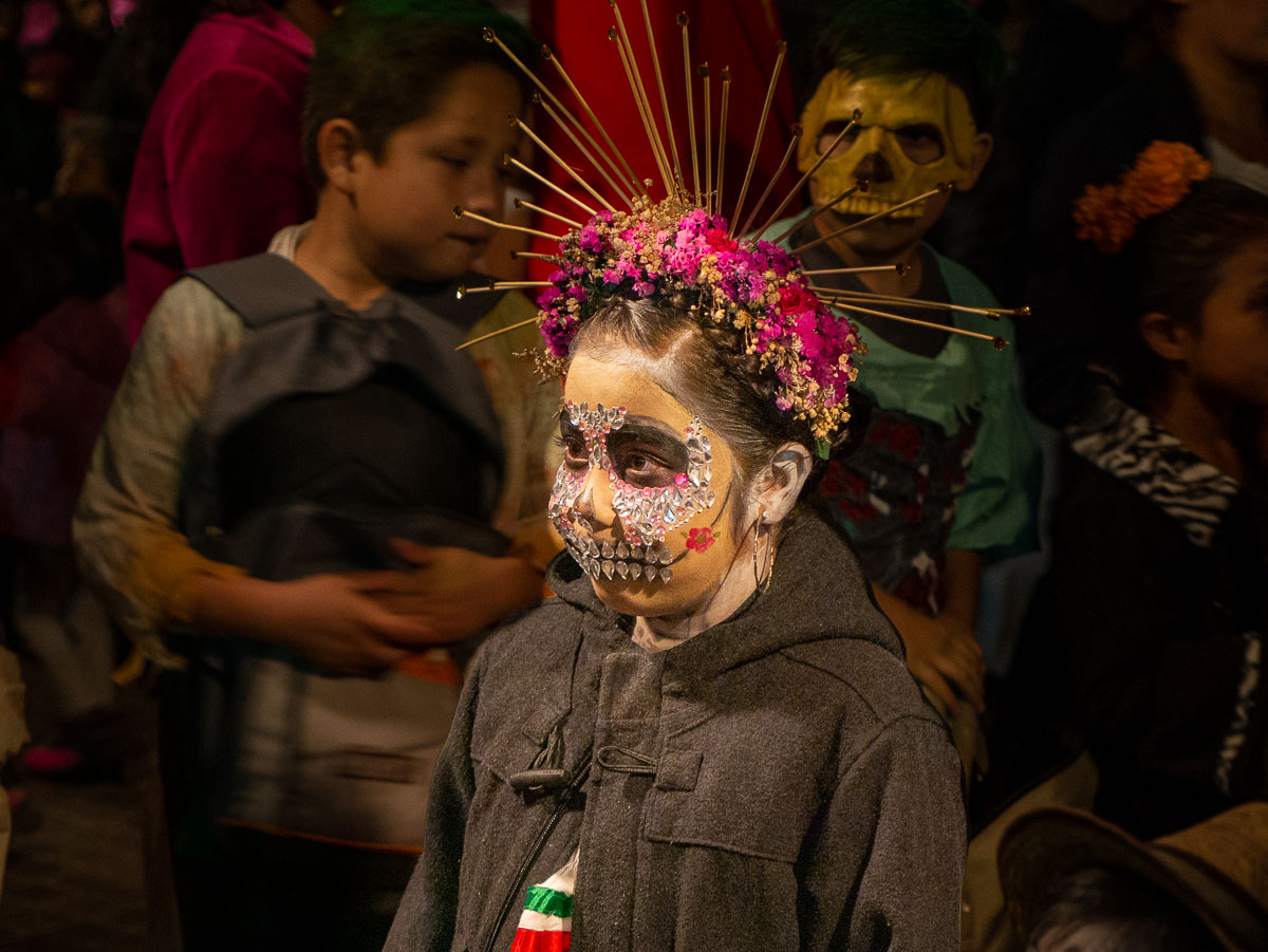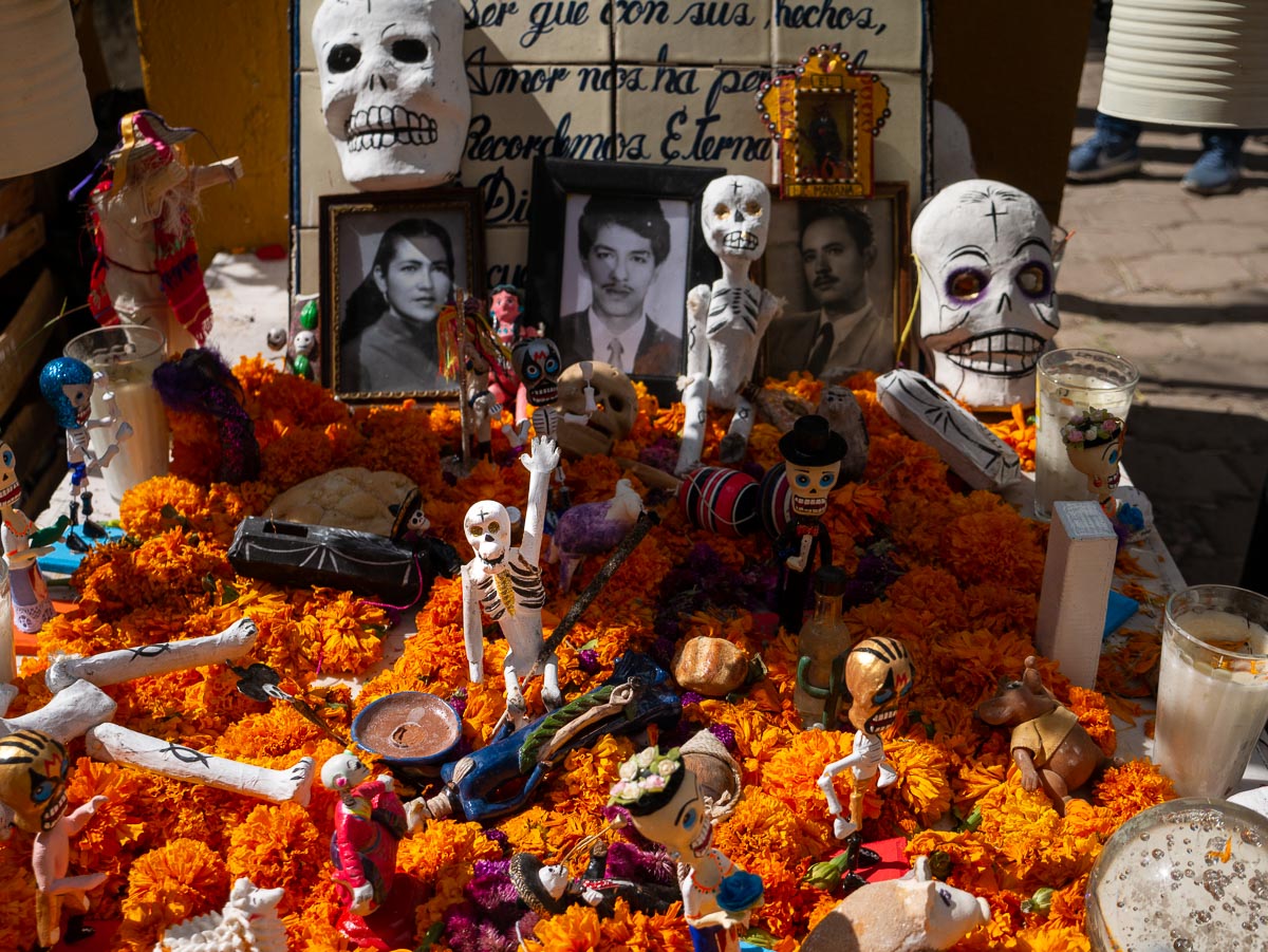 Leaving plenty of room, we followed down an alley to a church plaza where tables had been set up along the wall and people were having their faces made up. Just past the makeup tables, colourful ofrendas (altars) had been built to honour the departed.