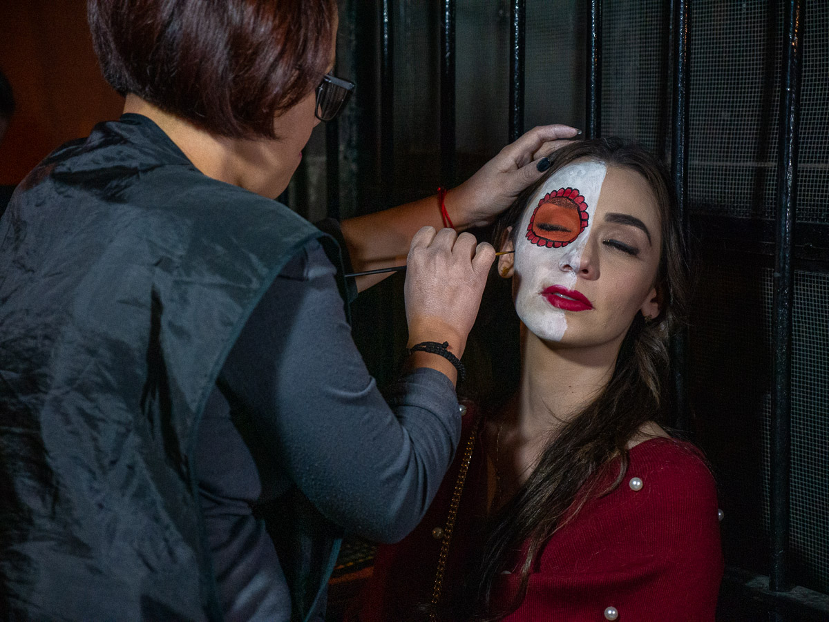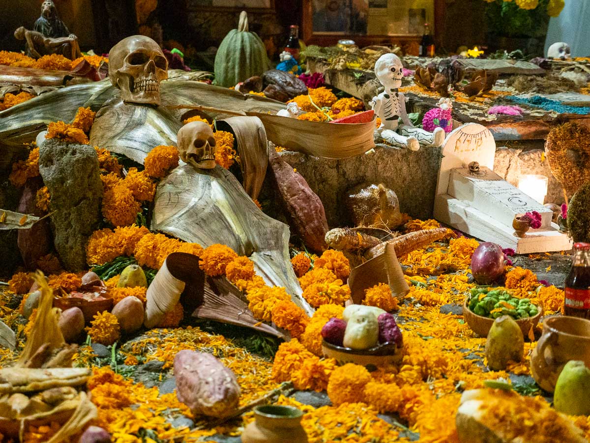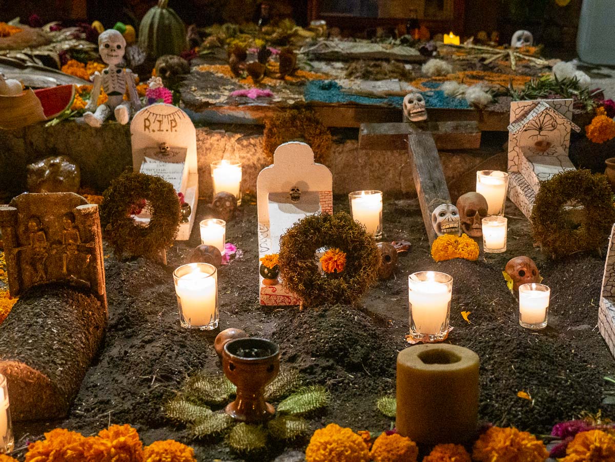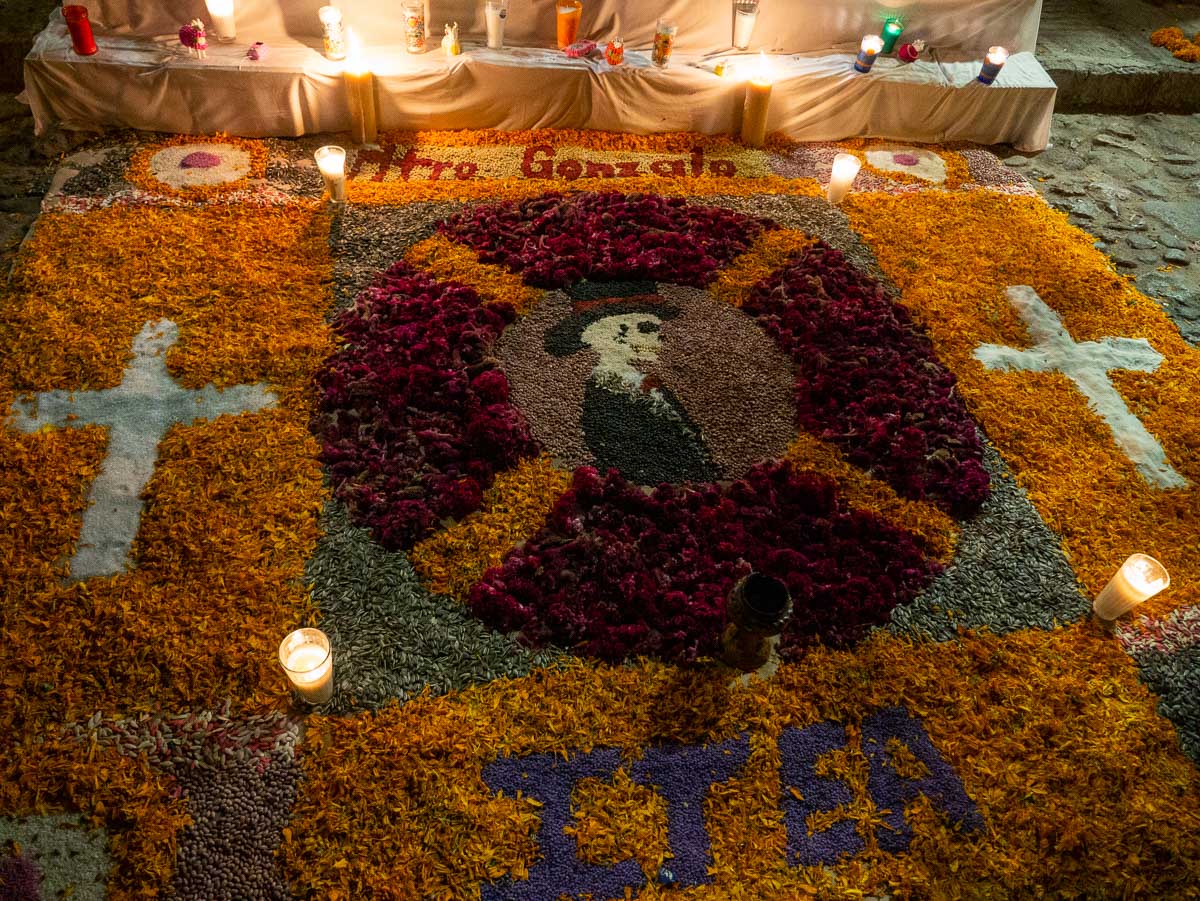 Leaving plenty of room, we followed down an alley to a church plaza where tables had been set up along the wall and people were having their faces made up. Just past the makeup tables, colourful ofrendas (altars) had been built to honour the departed.