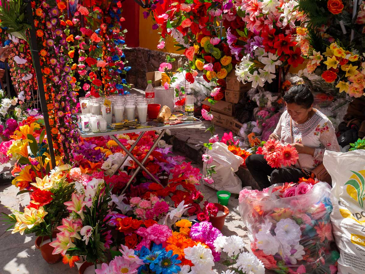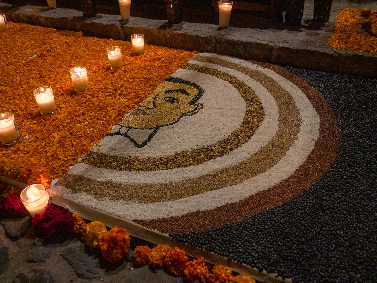We would discover ofrendas of all different kinds throughout the city over the next couple of days–in front of churches, in markets, down alleys and in businesses. We walked into one hotel on the afternoon of November 2 and found an artist was still creating a piece–hopefully, it will be usable in future years.
