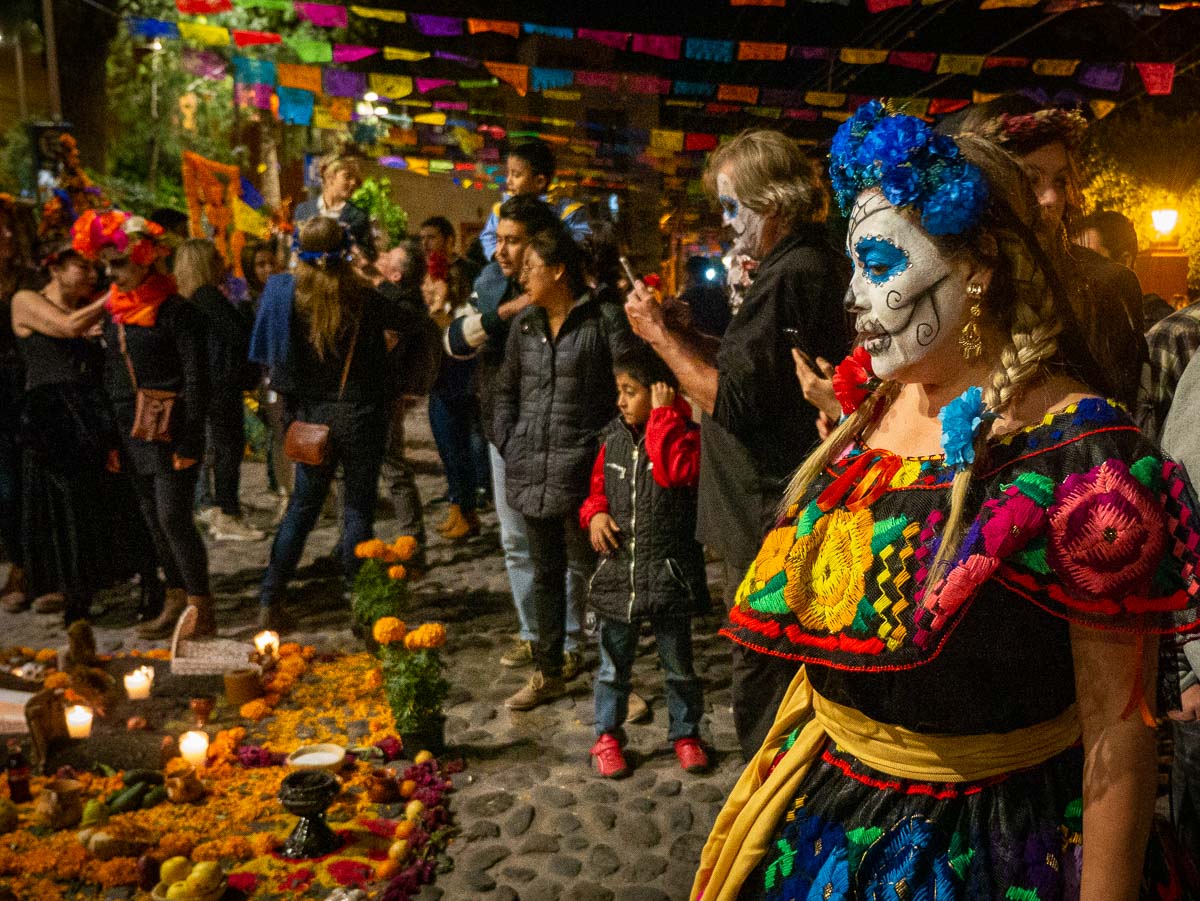 I had thought I would take lots of photos of the costumed over the weekend, but partway through I started feeling a bit odd about it. It seemed to me that those dressing up and carrying on were not of Mexican heritage. I’m not sure if that’s because the events we chose (for example, the parade we followed and the art walk) were expat/tourist-focused and we just didn’t have a chance to see the local celebrations, or if dressing up is not part of the local experience. As much fun as it all is, I would need to do some more research on this before getting involved myself (should we be in Mexico in November again). I would love to hear your thoughts and experiences.