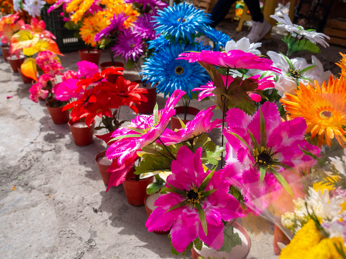 Families gather to clean up the graves and decorate them with flowers, papel picado (banners of coloured paper with designs punched into them), tapetes (literally rugs, but these are designs on the ground made from coloured sawdust, beans, and seeds), and the deceased’s favourite food and drink. We had read that makeup and costumes should not be worn to the cemeteries out of respect, so were surprised to see a few people (hopefully just unaware) who showed up this way.