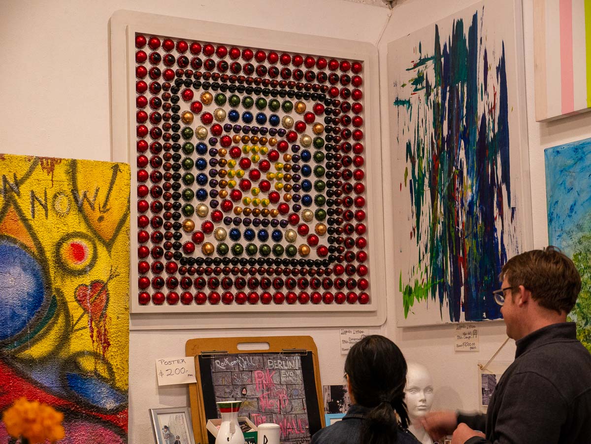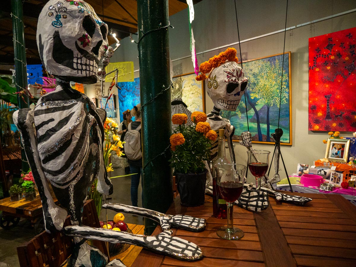 In San Miguel, on the first Saturday of each month, there is an art walk event at Fabrica la Aurora. November’s event landed on Día de Muertos and so it was billed as an art walk and ofrendas and was quite a party. The location used to be a textile factory and is now a center for art and design–an expansive set of buildings with art studios, galleries, and entertainment spaces, with old manufacturing equipment sometimes taking center stage. The art includes sculptures, paintings, jewelry, lighting and furniture, and was as varied as it was good. Though there were many outdoor and indoor places to gather and view the works, it often felt like patrons were there as much to socialize as they were to check out the art. People sat or stood around with glasses of wine or other beverages and caught up with friends with lots of music to keep things lively.