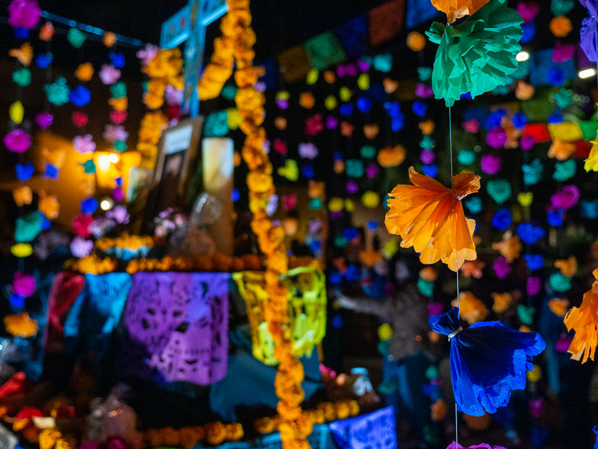 Families gather to clean up the graves and decorate them with flowers, papel picado (banners of coloured paper with designs punched into them), tapetes (literally rugs, but these are designs on the ground made from coloured sawdust, beans, and seeds), and the deceased’s favourite food and drink. We had read that makeup and costumes should not be worn to the cemeteries out of respect, so were surprised to see a few people (hopefully just unaware) who showed up this way.
