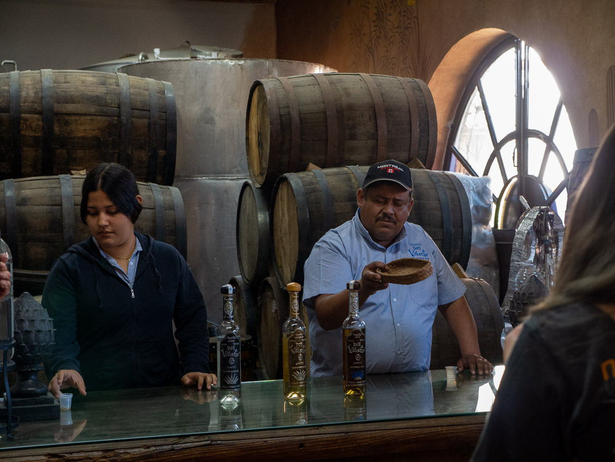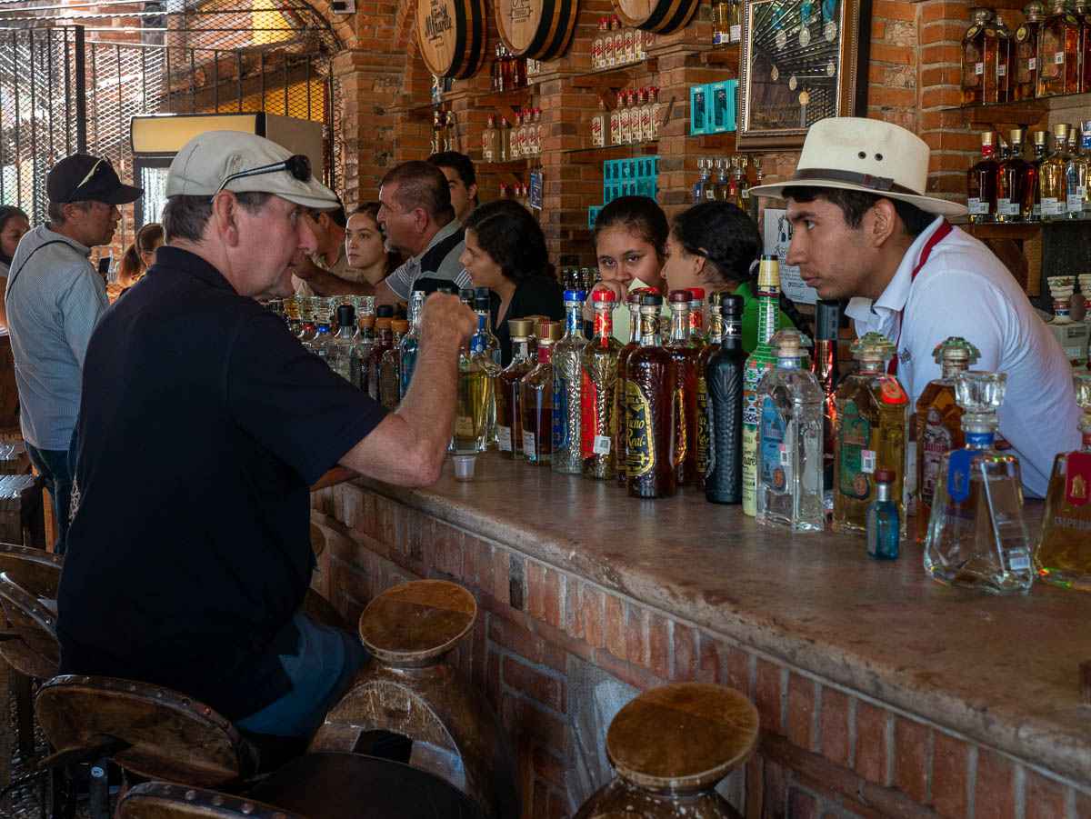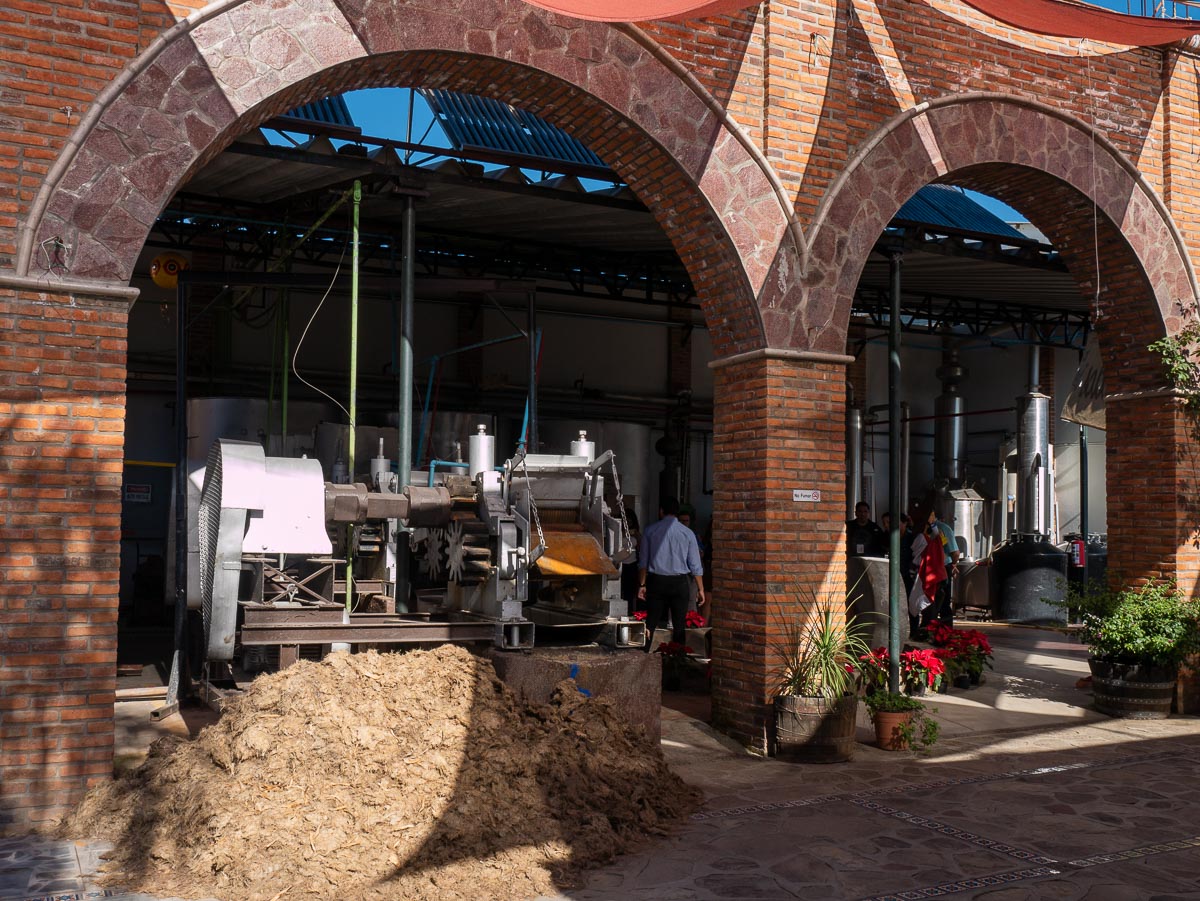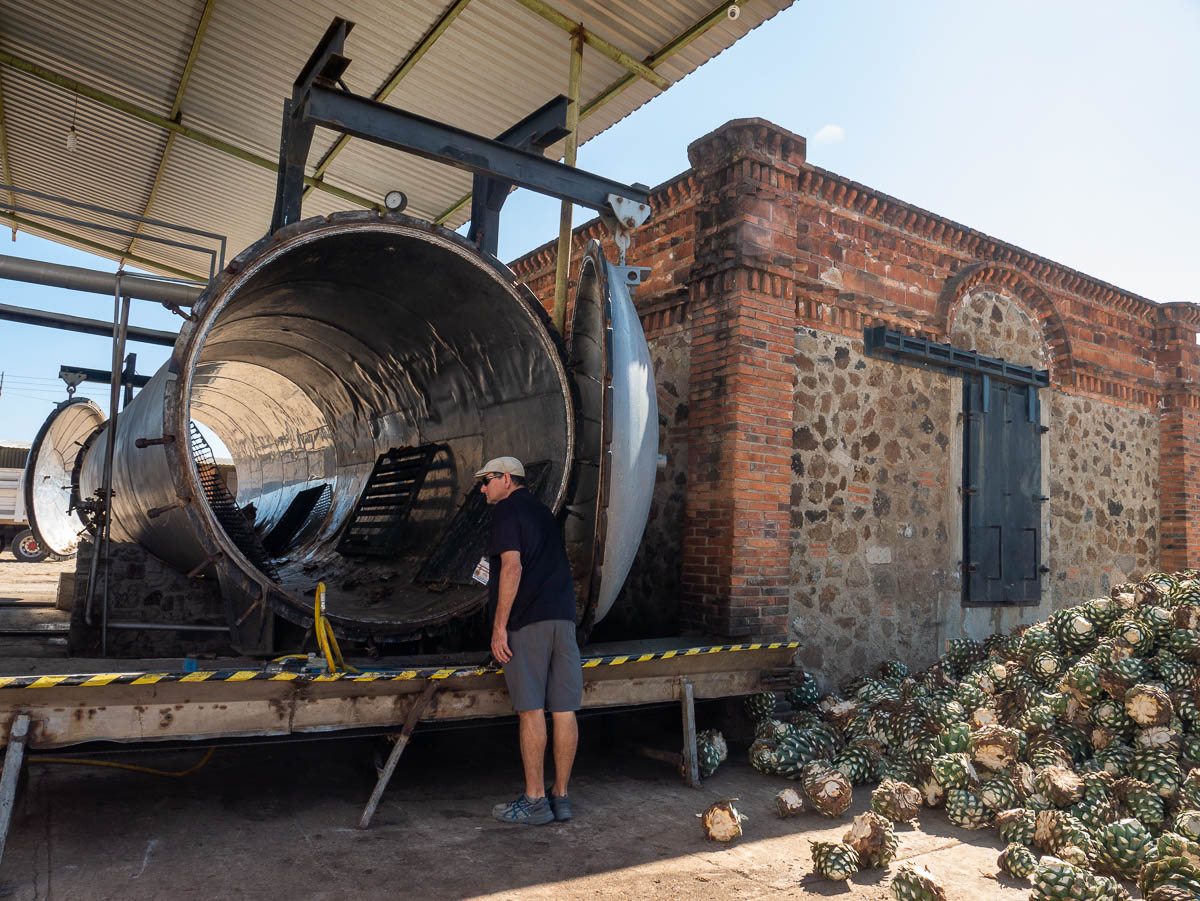 Our second stop was at a large distillery, called Los Tres Toños, where huge metal cylinders were used to cook the piñas rather than the stone oven that provided a backdrop for a pile of piñas (cooking in the oven is required for tequila to be labelled artisanal) and one machine completed the four-stage crushing process. The metal fermentation vats were huge and plentiful. The tasting area was large, which was needed to host the several vans of tourists who dropped in while we were there. The tastings and lengthy call-and-repeat pre-tasting toasts were conducted in Spanish. We missed a few chuckles, but other than that we understood enough to appreciate the different grades of tequila and tequila liqueurs on offer. I tried little sips of all of them except for the habanero-spiked one. Ken, being unable to see liquor wasted, finished all of his tastings and mine, too. This is another good reason to take a bus instead of your own car when heading to this region.