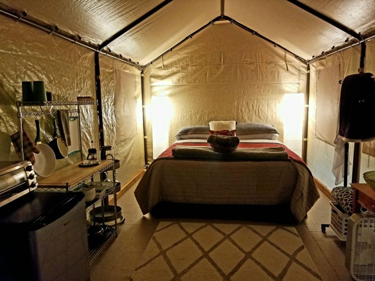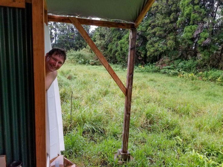 Our glamping AirBnB was only a few kilometres away from the Hawaiian Volcanos National Park. The hosts had done a great job of setting up a cozy living space inside what appeared to be a soft-sided garage kit. They had built it up on a platform, outfitted it with full plumbing for a toilet, sink, and outside shower, added electricity for lights, fridge, and stove, and provided a comfortable bed with loads of soft blankets and pillows, and warm lighting.