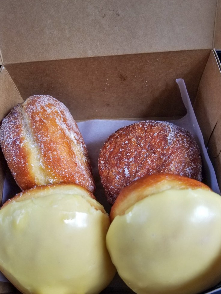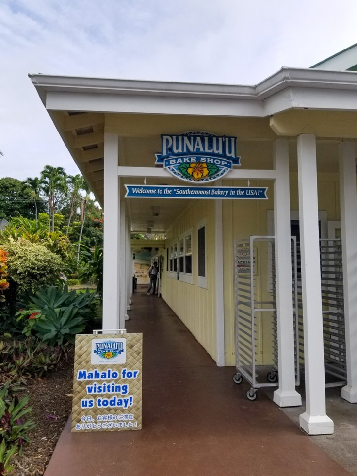 Our audio tour guide, Dave, advised us to make a stop at the Punalu’u Bake Shop on our way to the Hawai’i Volcanoes National Park, and we would advise the same. It’s in a great spot along the route from Kailua-Kona, showing up just when you’re thinking a stretch and/or bio break are due. Though you can pick up lunches and bread there, the star is the malasada—a doughnut-like confection of Portuguese origin but seemingly adopted in Hawai’i as its own. The Punalu’u Bake Shop offers malasadas in many flavours. We ordered a classic plain and a liliko‘i (passion fruit) glazed one for each of us. The winner (and their most popular)? Liliko‘i!