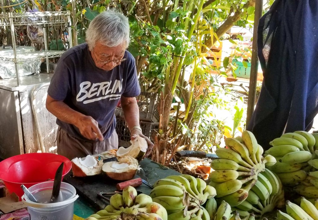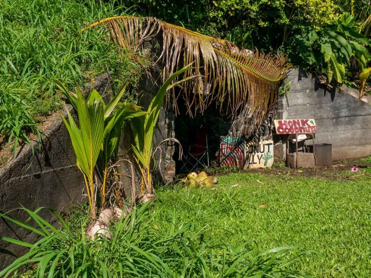 There are many shrimp trucks and produce stands to stop at along this route. Though a little pricey at $5 USD for a coconut, another stand on the big island had asked $10 for the same thing. We enjoyed the ice cold coconut juice first, and then handed our emptied fruit back to have the meat cut out and presented to us in a small baggie for later snacking.