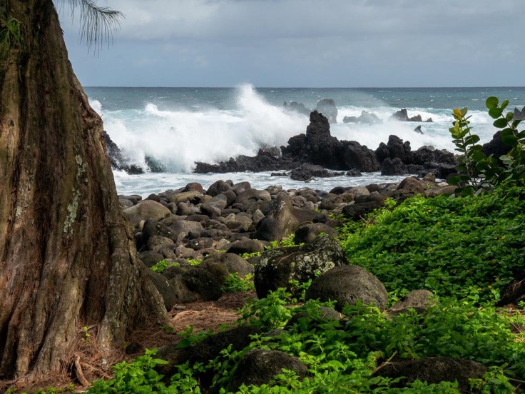 When you come across the Dole plantation, keep going. Or, if you’re into shopping at giant touristy stores, stop. If you have kids with you, maybe stop and do the maze. But definitely skip the train. We should have read the Trip Advisor reviews on this before forking out $12 USD (~$32 CAD for both of us) to ride a two-mile train through some not-very interesting fields while trying to hear the barely audible recorded soundtrack. The information provided could have easily been handled in a small room with dioramas and interpretive signs. (We’ve been on much better in-the-field, hands-on tours of pineapple plantations in other parts of the world.)