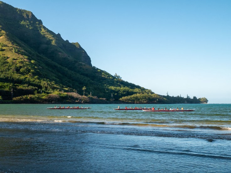 Our last stop was at Kahana Bay Beach Park, just in time to watch teams launch themselves in four red outriggers.