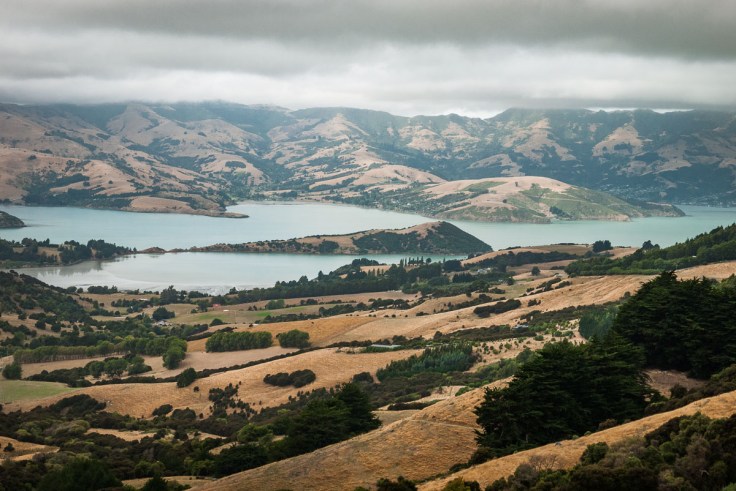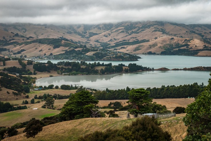 When we got to the center of the peninsula, we had to make a decision between taking a road down into Akaroa Harbour or taking what was labelled the tourist route–a ridge road around the summit before dropping down to Akaroa on the other side. It was quite cloudy and we could barely see the top of the hills, so we chose to drive the lower route down with a plan to return via the summit route when the forecast was for brighter skies. Our strategy worked perfectly.
