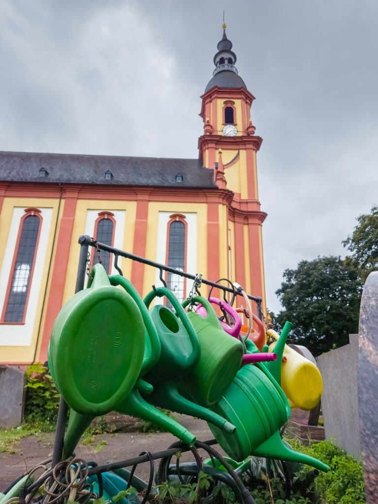 Another building that surprised us was the Basilica of St. Paulinus, an 18th century baroque church. Its outside was bright and colourful and its insides, in contrast to the many much-older churches we had been poking our heads into, were white and bright, with colourful ceiling frescos. The cemetery plots in the churchyard were the tidiest we’ve ever seen, many were little landscaped works of art. Throughout the cemetery were metal stands holding clusters of brightly coloured plastic watering cans–I thought this was a really cool demonstration of community spirit until I discovered that each separate can was padlocked to the stand, intended only for use by its owner.