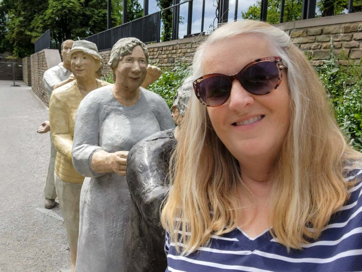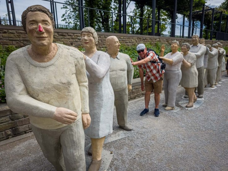 A temporary exhibit of sculptures called Alltagsmenschen (Everyday People) entertained us as we walked throughout the city. As well as the ones pictured here, there was a man with two dogs on the lawn of the Electoral Palace, several perched up on private balconies watching the world below, and snorkelers getting ready to dive off of high brick walls into the river. We didn’t see all 40 of the sculptures, but the ones we did come across put a smile on our faces.