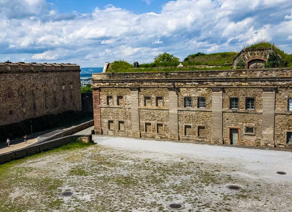 Not far from Deutsches Eck is the gondola base where you catch a ride across the river and up to the fortress on the other side. Representing 5,000 years of history, the buildings are now used for many purposes. At one end, there is a youth hostel. You can wander through several museums, though what might have been the largest one was closed when we were there. Some buildings are set up for special events. One large open area was prepped for what would be an evening outdoor concert. We enjoyed the viticulture (wine-making) museum, which talked about the history of wine in the area, and we learned how white asparagus (very popular and in season in early June) is cultivated.