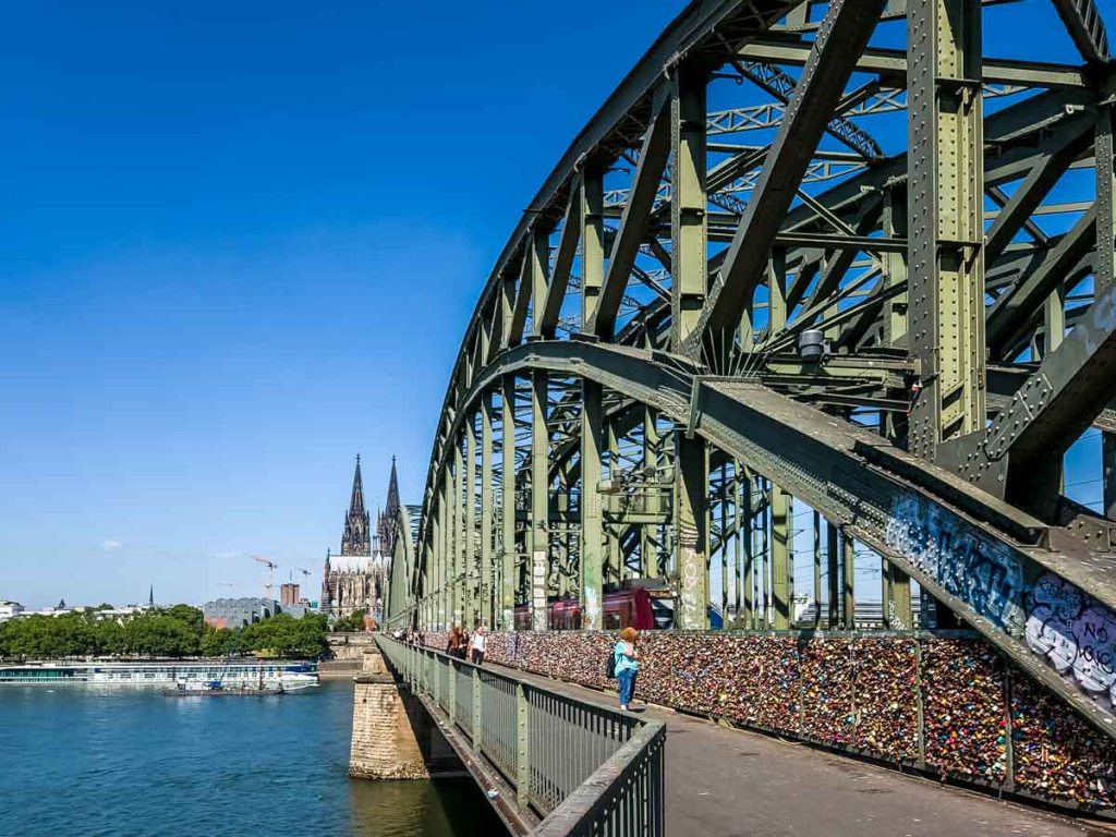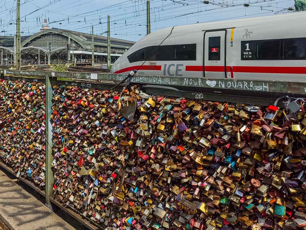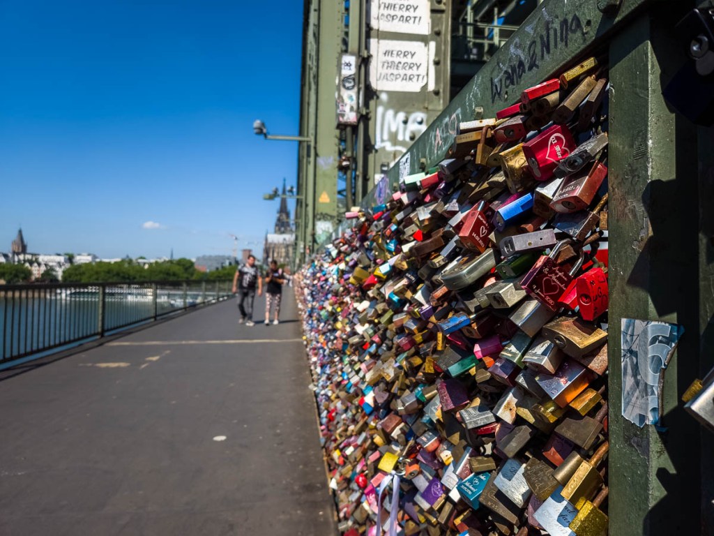The Hohenzollern Bridge crosses the Rhine, and rumbles with the weight of 1,200 trains a day as they arrive and depart from the Cologne central station (Köln HBF). The fences between the pedestrian walkways and the trains are laden with love locks, more than we’ve ever seen on a bridge. They grow up the posts like ivy, in dripping clusters from cable and chain locks, wherever a place to loop a lock can be found. The fence around the plaza at the downtown end of the bridge seems to be taking the overflow, perhaps starting a new trend with some posts sporting only a single lock so far, but others showing signs that they, too, will soon be completely encased.
