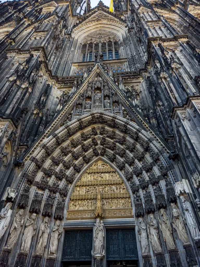 Next to the station is the massive Cologne Cathedral (Kölner Dom). Originally planned to be the largest and highest church in Europe, construction began in the 13th century. Six centuries later, in 1880, a grand opening was held on completion of construction. Even then, interior work continued, and some work is always ongoing, with scaffolding perpetually in sight.