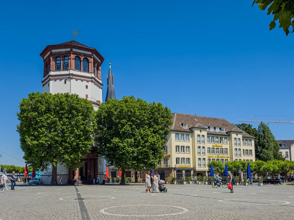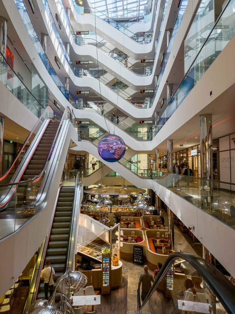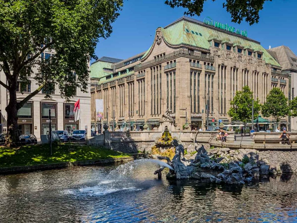 Roughly half the size of Cologne, Düsseldorf is home to the kilometre-long high-end exclusive shopping street, Königsalle (or just Kö to the locals). The grand boulevard is divided by a well-treed canal with several bridges crossing it. One side is mostly brand label shops and glitzy malls dotted with sidewalk cafes and restaurants, and the other side is stately financial buildings. Not a McDonalds in sight, thanks to a hard-fought battle by the merchants in the 1990s to retain the exclusive ambiance of the street.