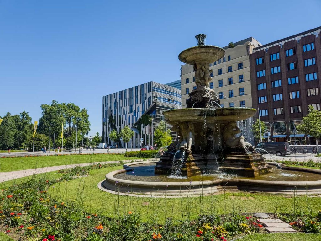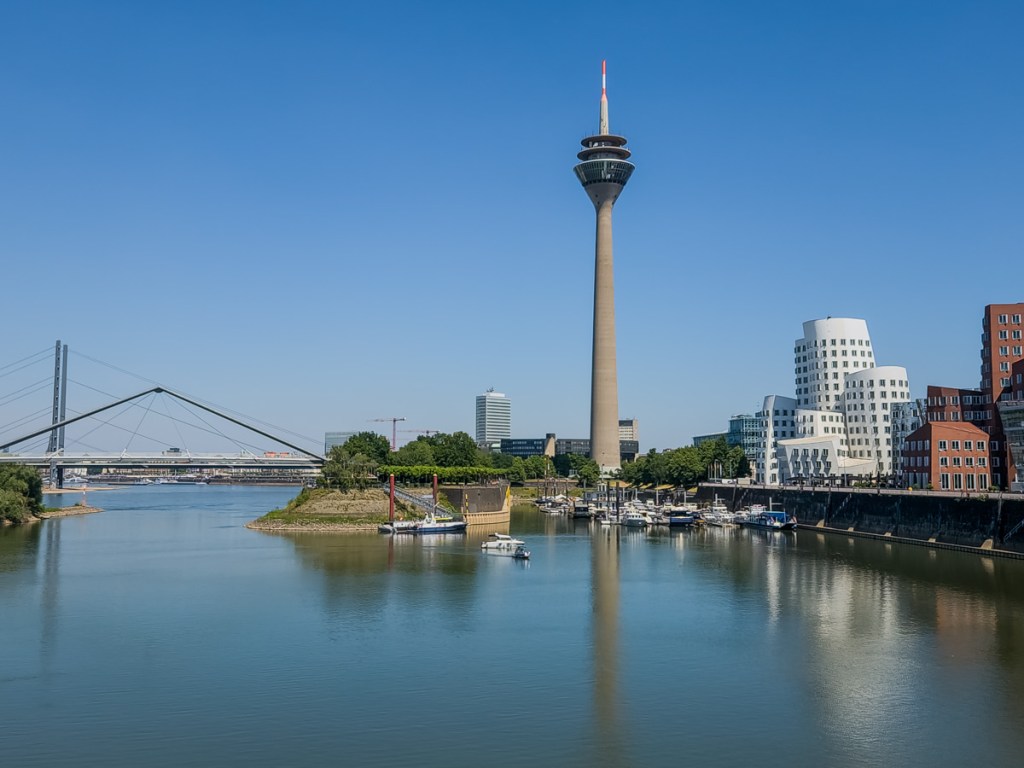 The Rhine Tower overlooks the parliament buildings and nearby is the Neuen Zollhof (new customs yard). A single project designed by Frank Gehry (Canadian-American architect), the three building clusters are made with completely different materials and different shapes. All are asymmetrical with angled-out windows and varying heights, but one is white and round, another is silver, wavy and reflective, and the last is all odd angles and brick. They now form part of an iconic view of Düsseldorf.