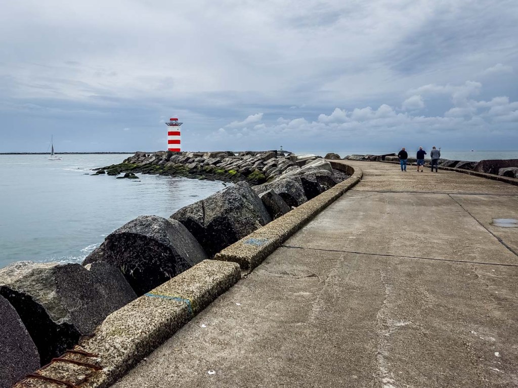 On either side of the North Sea Canal are beach areas, each framed by incredibly long piers. We drove around to the north beach and walked out onto the pier. These are not your usual pier strolls. The north and south piers extend, respectively, 2.2 and 2.9 km into the sea from long, sandy beaches. As we walked we passed by occasional fishers trying their luck, but we didn’t see any of them catch anything.