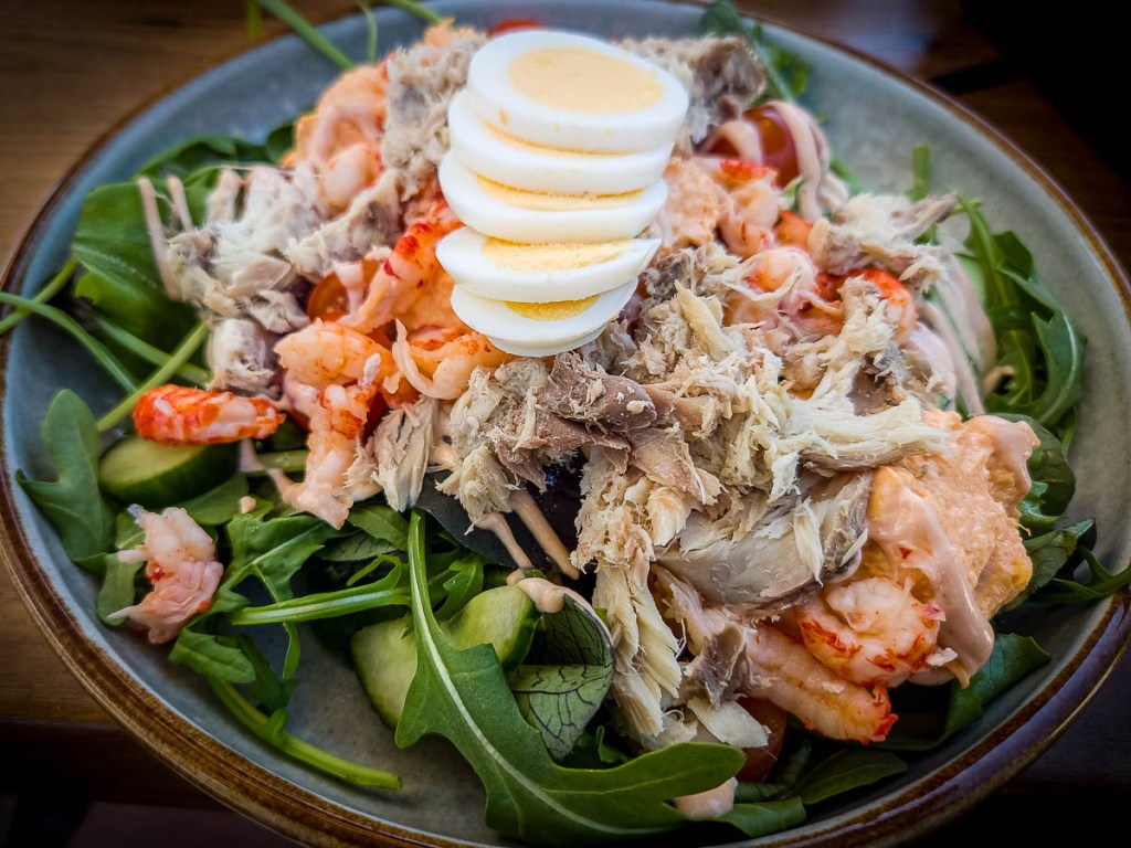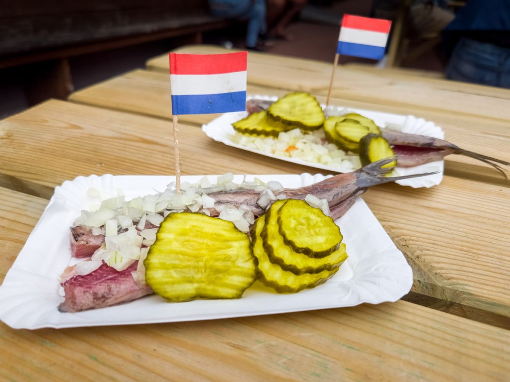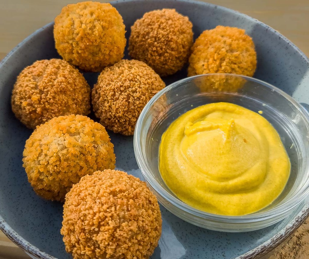 Our host let us know about the one-day herring-season-opening festival at the restaurant across the street from the house. They were offering all-you-can-eat herring, traditional street food in the Netherlands. Depending on the locale, it can be served whole with tail on or in pieces, but always with raw onions and pickles. Though ours came with the Netherlands flag toothpick, apparently if it is served whole (split with the main bone removed) you are supposed to pick the fish up by the tail and start eating from the opposite end. I’m not sure how you eat it with the onions and pickles if you do that. We both enjoyed it–the fish was fresh and moist and mild flavoured. I’m not a raw-onion eater, but I did like the pickles with it. To add to our snack, we ordered bitterballen, another traditional bar treat that our son had introduced us to while we were in The Hague. Bitterballen are like a round croquette filled with a creamy meat-based mixture, breaded and deep-fried, and typically served with mustard.