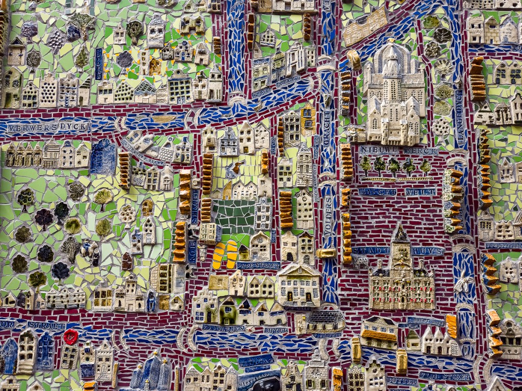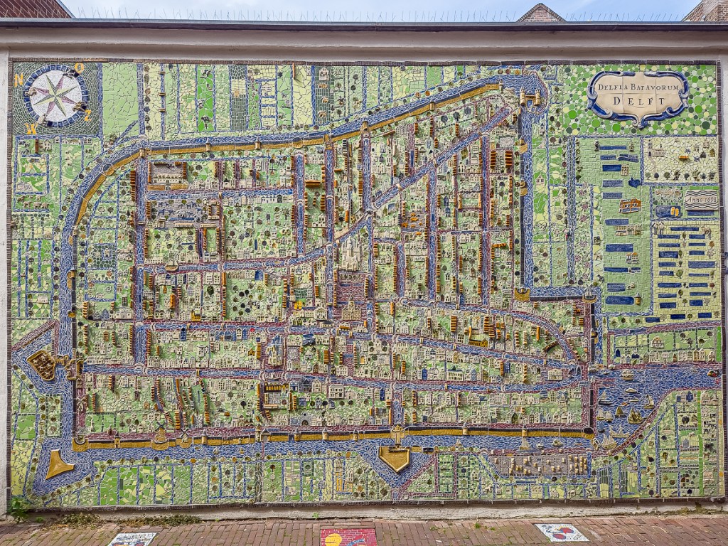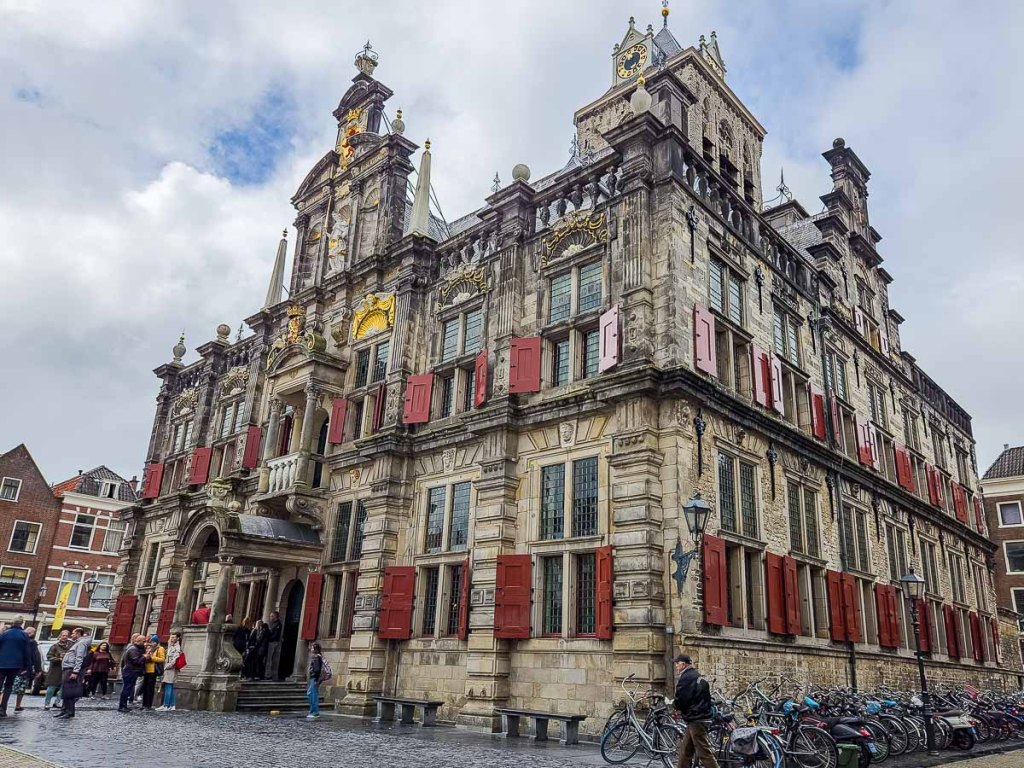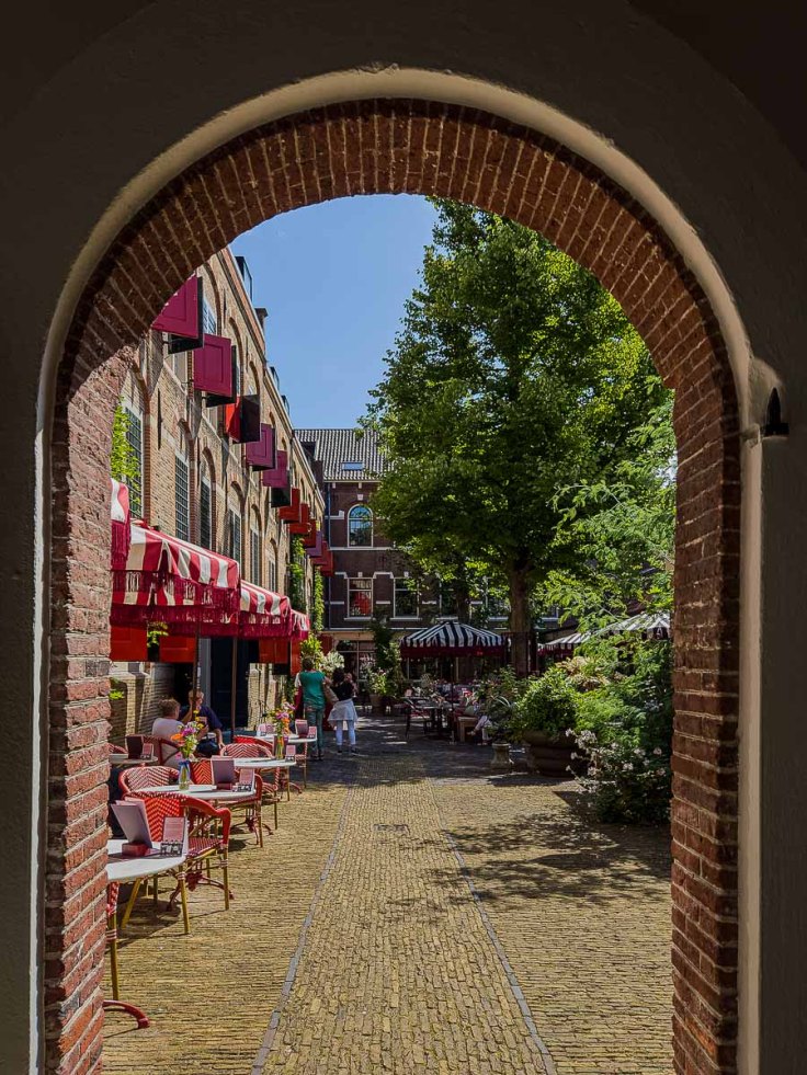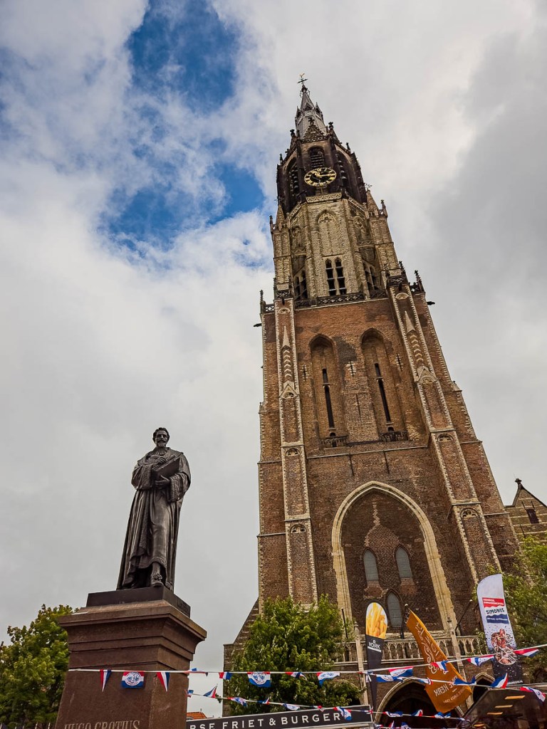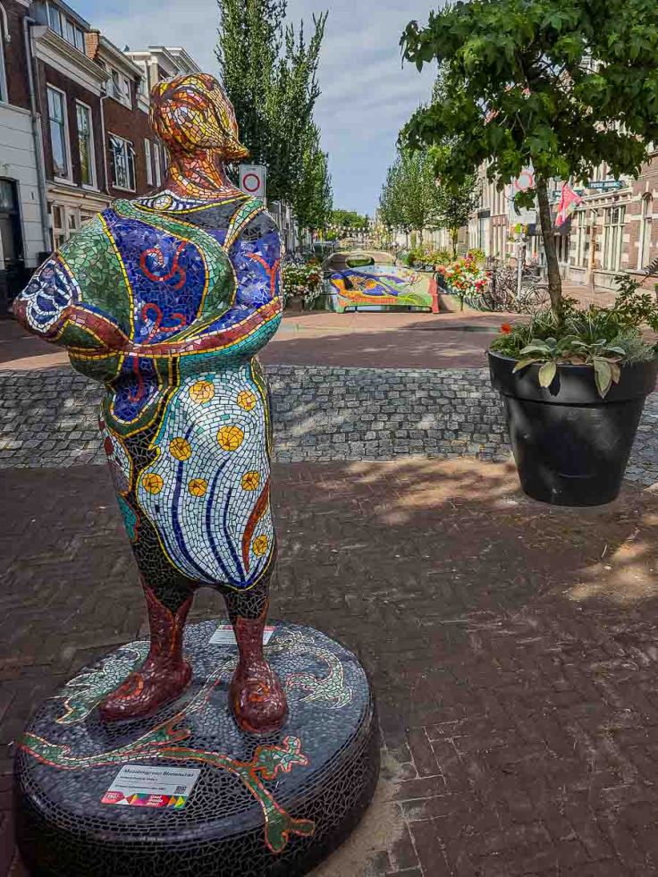 Our first trip to Delft was on what turned out to be a windy, rainy market day. We arrived just in time to have a coffee on a patio while listening to a carillon concert and then explored the market area, which fills up the main square with trailers and tents. The long bakery kiosk near the church offered up wonderful breads and pastries for very good prices. It was busy, but worth the short wait. The fish market was busy as lunch approached, with one end focused on deep-fried takeout. We tried traditional kibbling there and it was fantastic. One order (€10) provided plenty for two of us with a mound of fresh fish pieces with a tartar-sauce-like dip. We managed to finish our lunch just as the storm hit. We decided right then to plan a return trip on a non-market day so we could see the square and surrounding buildings and wander the streets and canals.