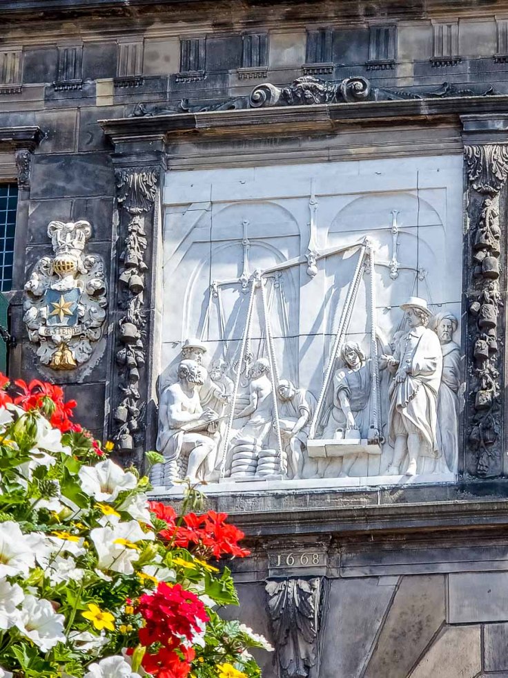 Though I knew it would be a tourist spectacle, I wanted to visit Gouda (pronounced HOW-da, not GOO-da) on Cheese Market day (Thursdays, 10-12:30, April to September). It was a good choice because the Cheese Market demonstrates an important piece of Gouda’s history of Gouda (and of several other cheese-making towns of the Netherlands). When we arrived, we found pallets of cheese wheels laid out in two rows in front of the Stadhuis (15th-century town hall). A little before starting time, a few horse-and-wagon rigs came around between the rows.