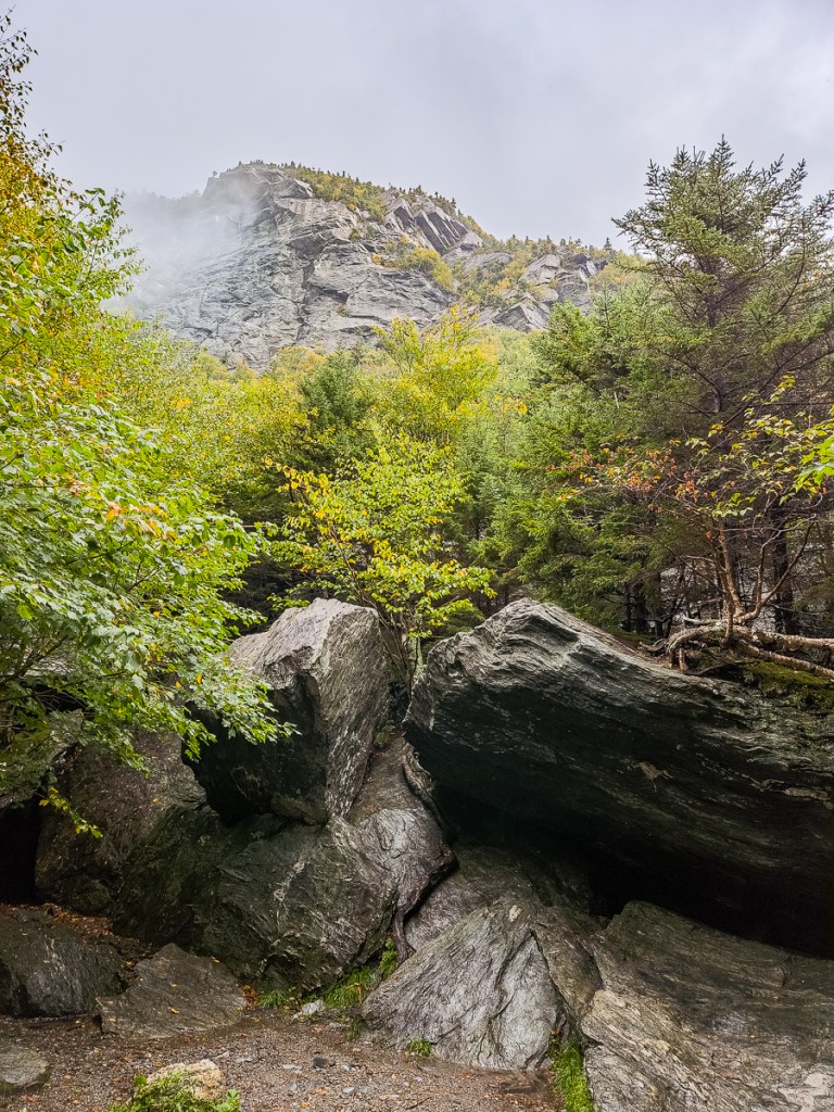The three-and-a-half mile drive, often only wide enough for a single vehicle, winds around rocky outcroppings and up and over hills that offered no visibility to what might be coming. Thankfully, we drove it in the off-season with ski resorts and ice-climbing not yet started and summer activities over and done in the cool damp weather. Even still, it was a bit of adrenaline-fueled fun. Unfortunately, with no place to pull over safely, there are no pictures to prove that we did it.
