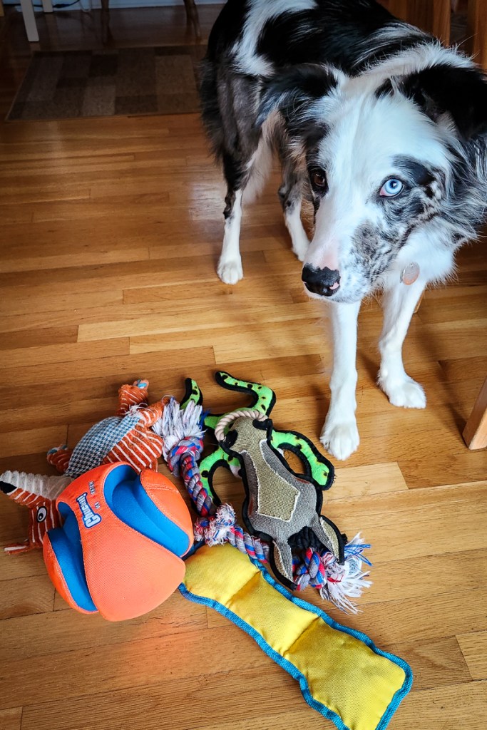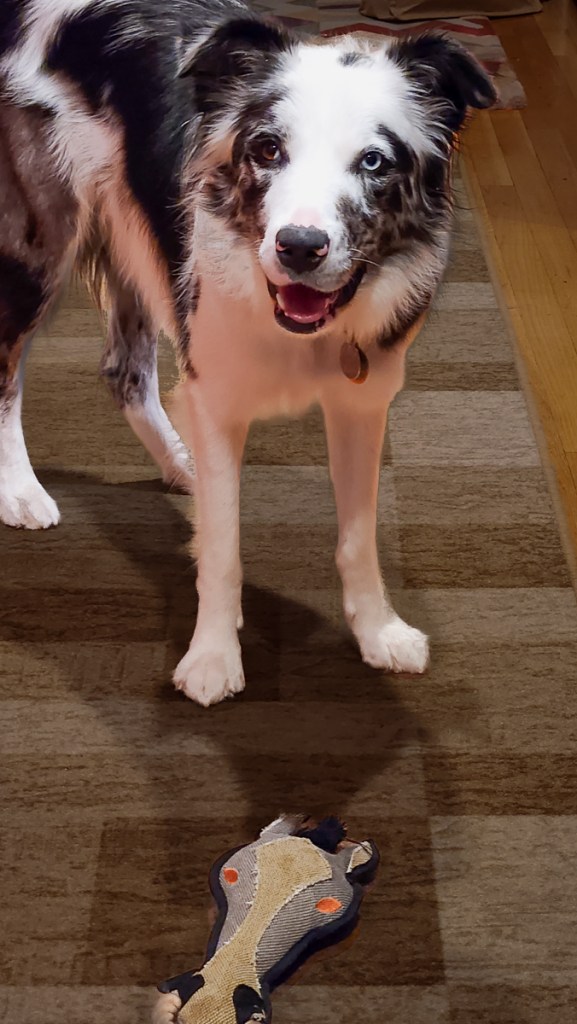 Our time in Long Valley, New Jersey, was busy but loads of fun. We were taking care of Mr. Kipling, a two-year-old border collie who had been kept very intellectually stimulated by his pet parent. As well as taking him to his agility classes, and out for regular walks among beautiful acreages, we worked on his vocabulary and finding skills. He had a big bag of stuffed toys and each one had a unique name. Sometimes we would hide the toys around the kitchen and he would go bring the correct toy on command and drop it into the waiting bag. Other times, we had him root around through the full bag and bring the named toy to us. His basement held a mini-agility course so we could run him around that when the weather wasn’t great.