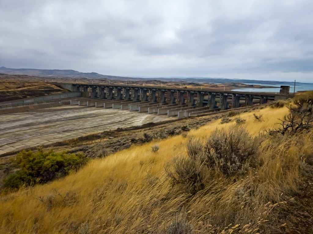 Before we crossed the border back into Canada we made one more overnight stop in Fort Peck, Montana. There is a full campground there, but it was closed for the season. Just a wee bit farther was an Army Corps of Engineers campground right on the lake and free to stay at. It was cold, windy, and drizzly, but still a lovely spot to stay. On our way there, we drove up to an overlook to view the Fort Peck Dam.