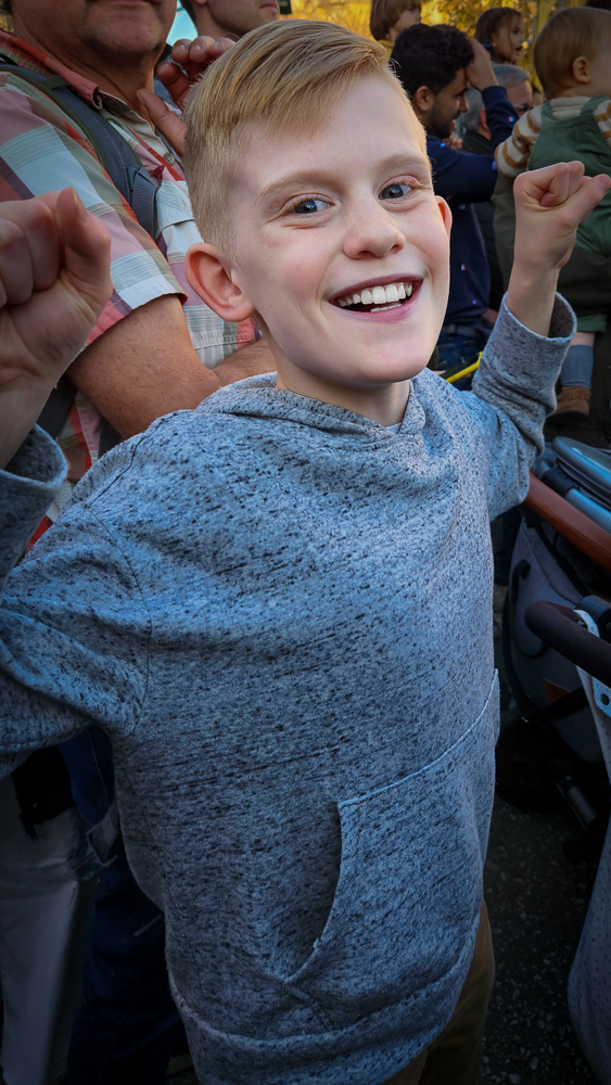 Crowds lined the streets to watch multitudes of costumed kings and other characters walk or ride the route on floats. As they passed by, everyone cheered and hollered, encouraging the riders to share their treasures. Candy and other gifts rained down by the handfuls–sometimes by entire bagfuls. Parents holding babes or toddlers sheltered their heads or turned away to avoid having their children pelted with treats. Kids held out open backpacks and bags and scrambled on the ground to scoop up as much of the loot as they could. Someone passed Alex a plastic bag so he could collect more than what his pockets could hold, and then that group handed back handfuls that they collected and didn’t want. Alex was great about sharing the wealth and passed his own extra handfuls back to a girl who was sitting atop her dad’s shoulders behind us where the tossed candy wasn’t quite reaching.