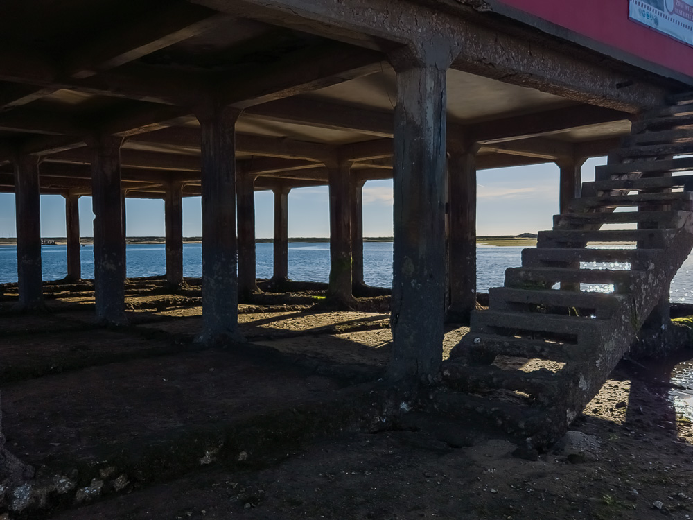 A sidewalk leads out of the little commercial area of town through a section of bungalows and then connects with a boardwalk for the rest of the walk across the island. In winter, at least, there is just one business at the end of the boardwalk–a cute little beach bar serving drinks and snacks (ask for the key to the little washroom back on the boardwalk). The provided chairs and umbrellas made it a lovely spot to stop and enjoy the ocean view. From there the walk along the beach to Ilha do Farol took about 45 minutes (we were not in a hurry). Once in town, we walked across the island’s point to locate the ferry dock and then tried to find something to eat as we had not packed food with us (there’s a tip here–don’t expect to find open restaurants in January). Finally, we found one little out-of-the-way café on the opposite side of the point (back near the lighthouse) that served us a gigantic toastie sandwich (1/4 of the sandwich was almost like a whole normal sandwich).