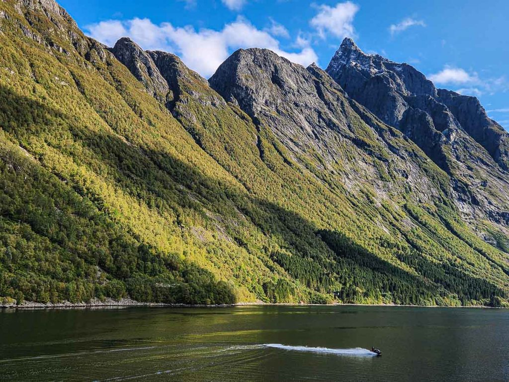 After visiting a couple of towns in the middle of the night (which we didn’t even notice), we made a quick stop in Ålesund and then carried on up Hjørundfjorden (we would return for a longer stop in Ålesund that evening). To visit Urke, the ship needed to anchor up an inlet past the village and then a local boat made several trips back and forth between the ship and the town’s dock. The boat captain was surprised that the ship captain chose to anchor so far away because each transfer took longer than expected and people were left waiting on the ship (to go to Urke) or on the dock (to return to the ship) for quite a while.